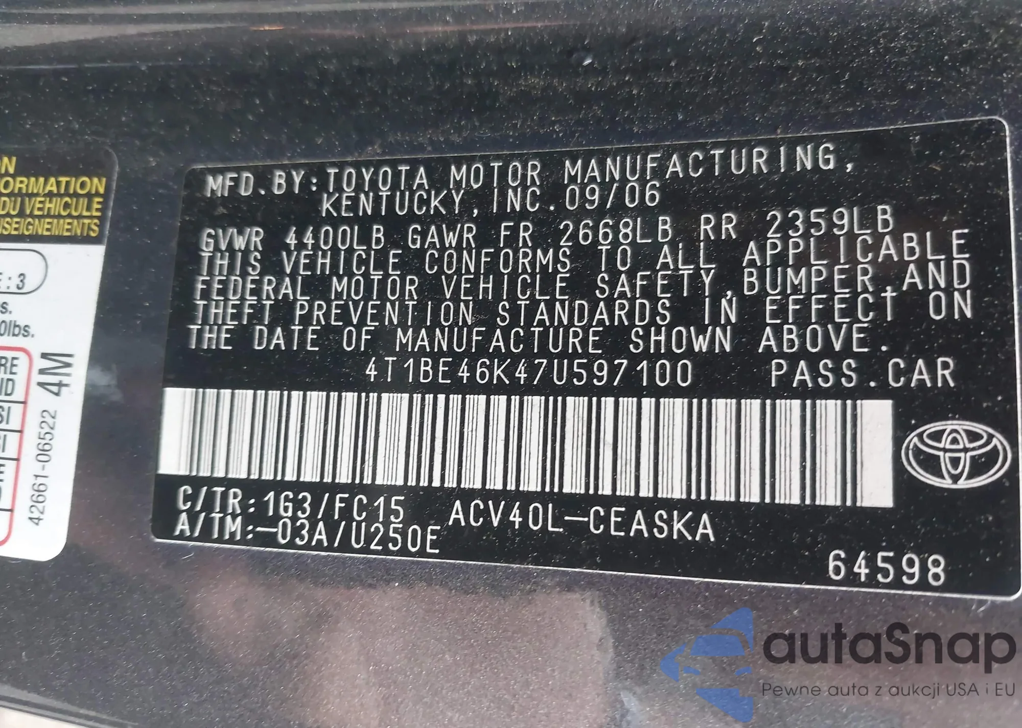 • VIN 4T1BE46K47U597100