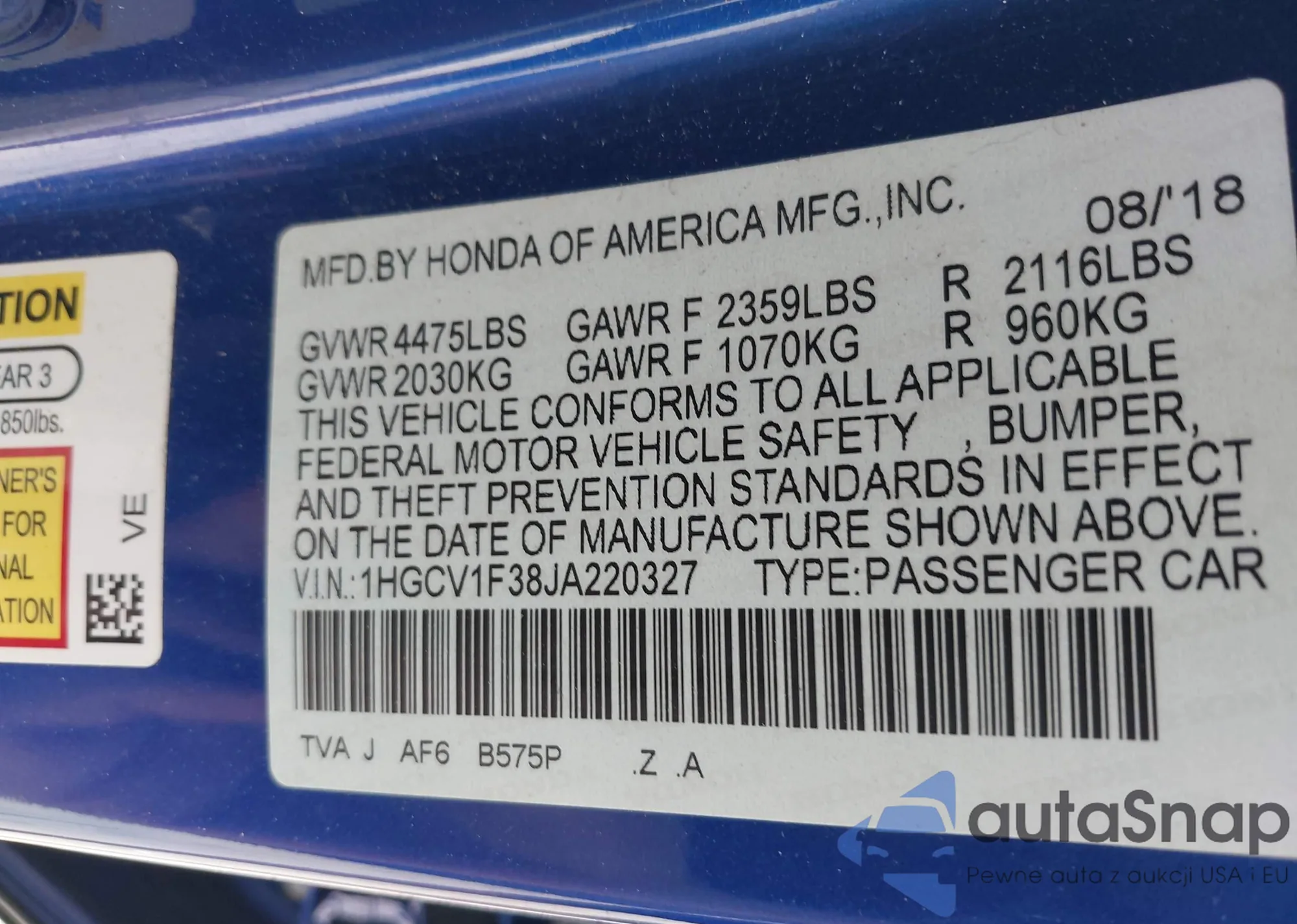 • VIN 1HGCV1F38JA220327