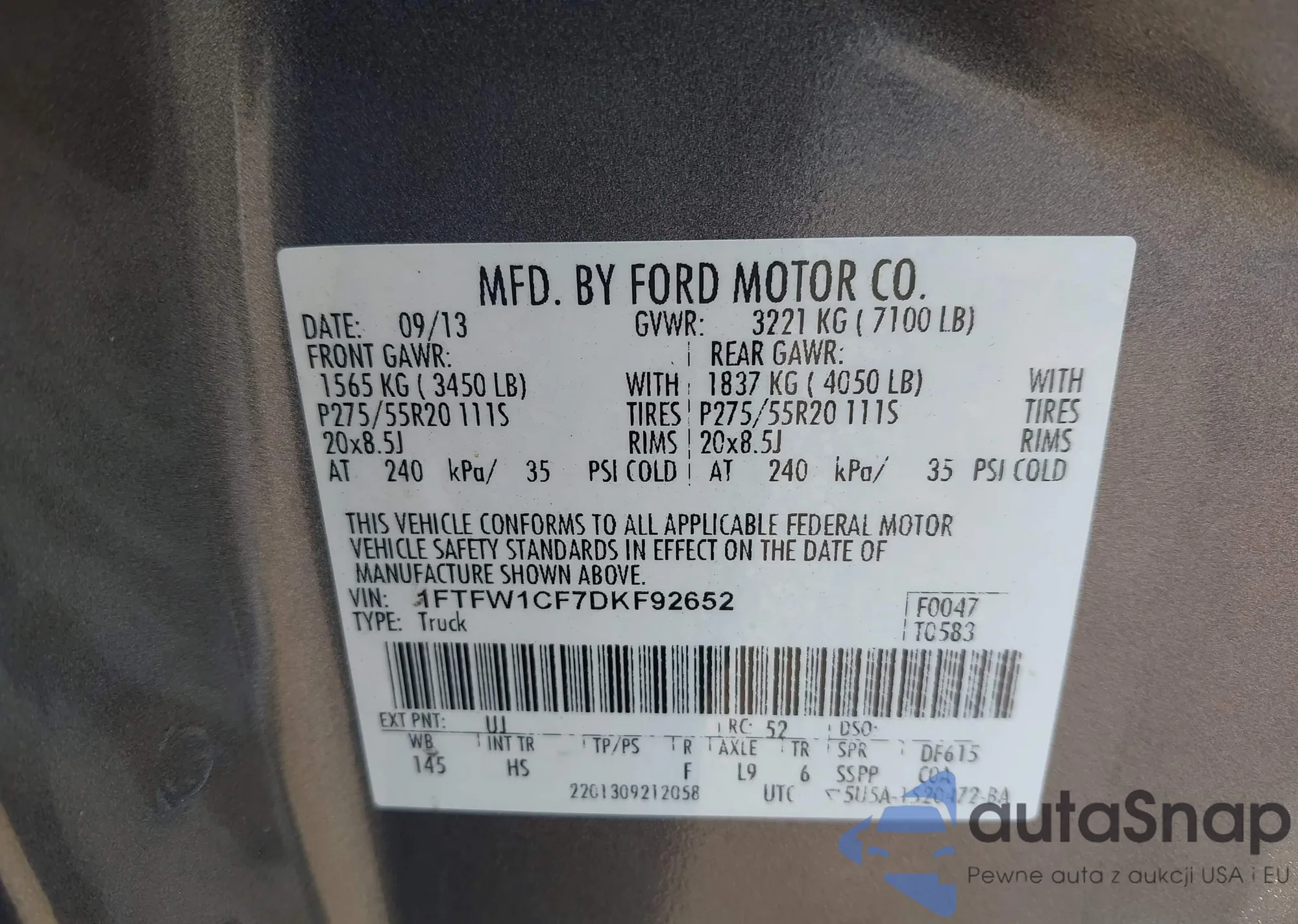 • VIN 1FTFW1CF7DKF92652