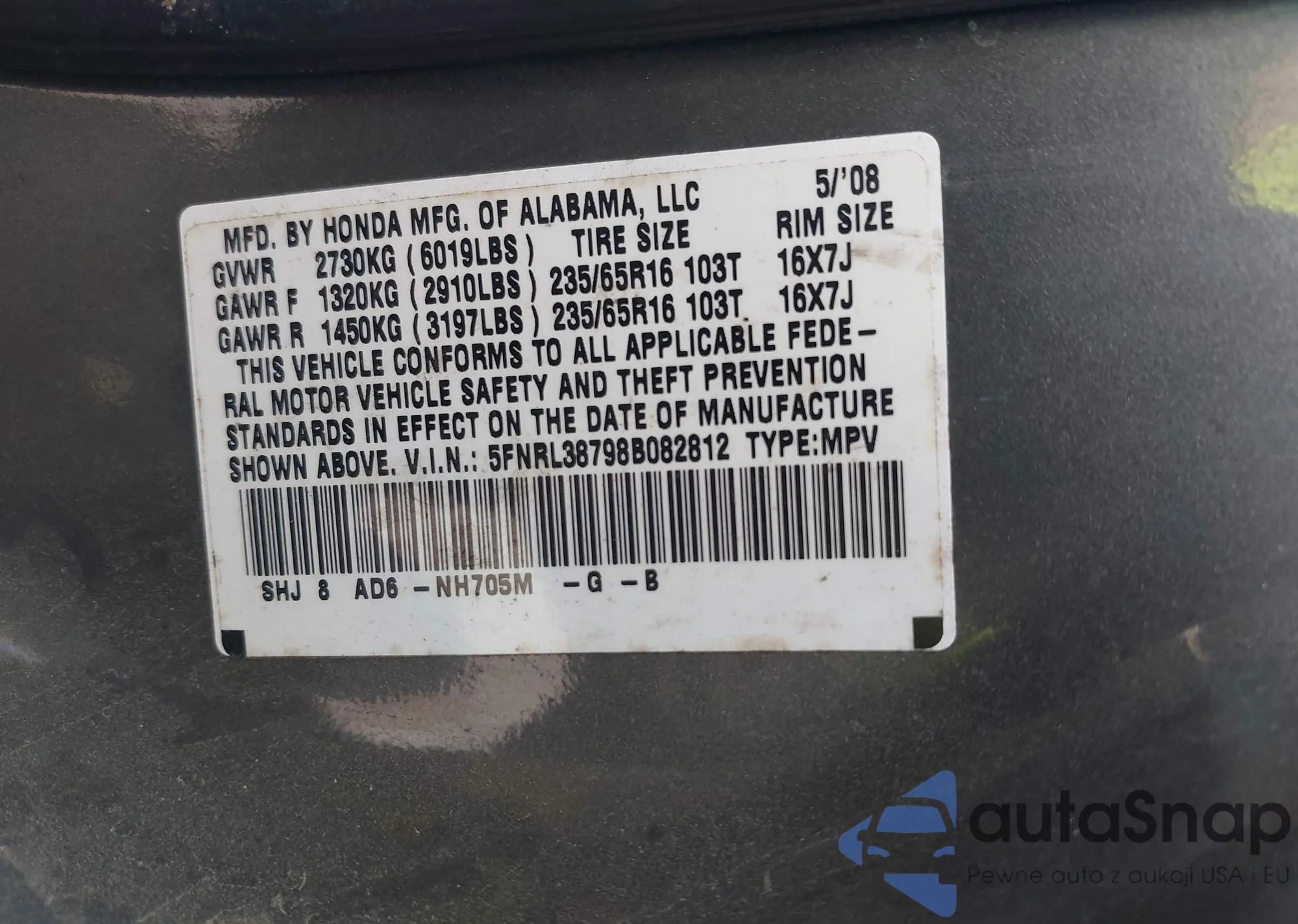 LOT: 42638605 VIN: 5FNRL38798B082812