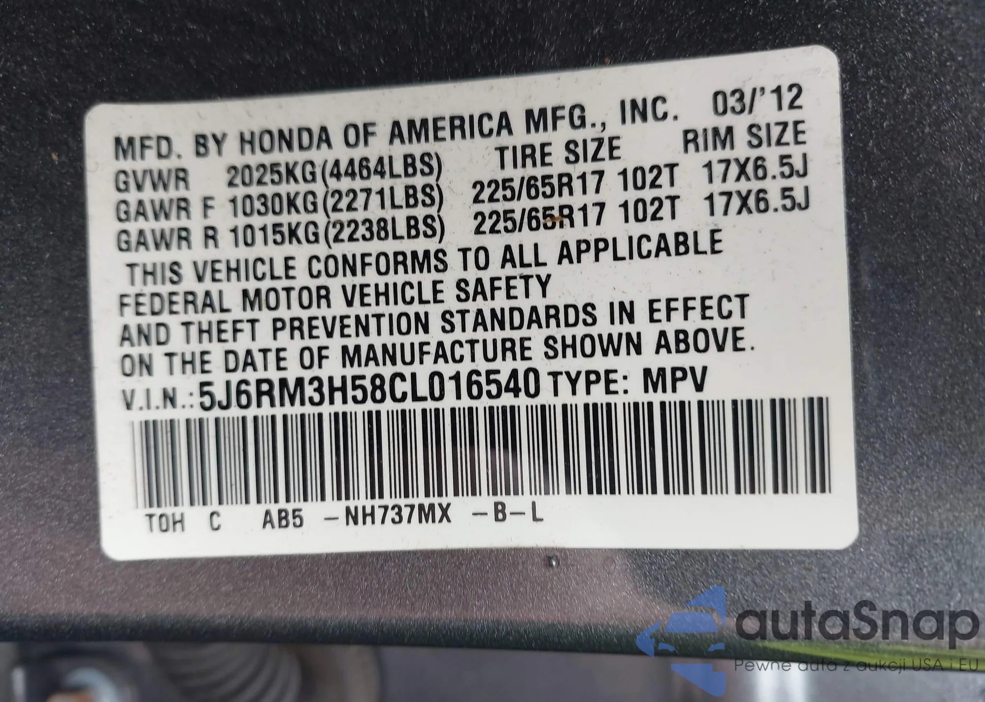 • VIN 5J6RM3H58CL016540