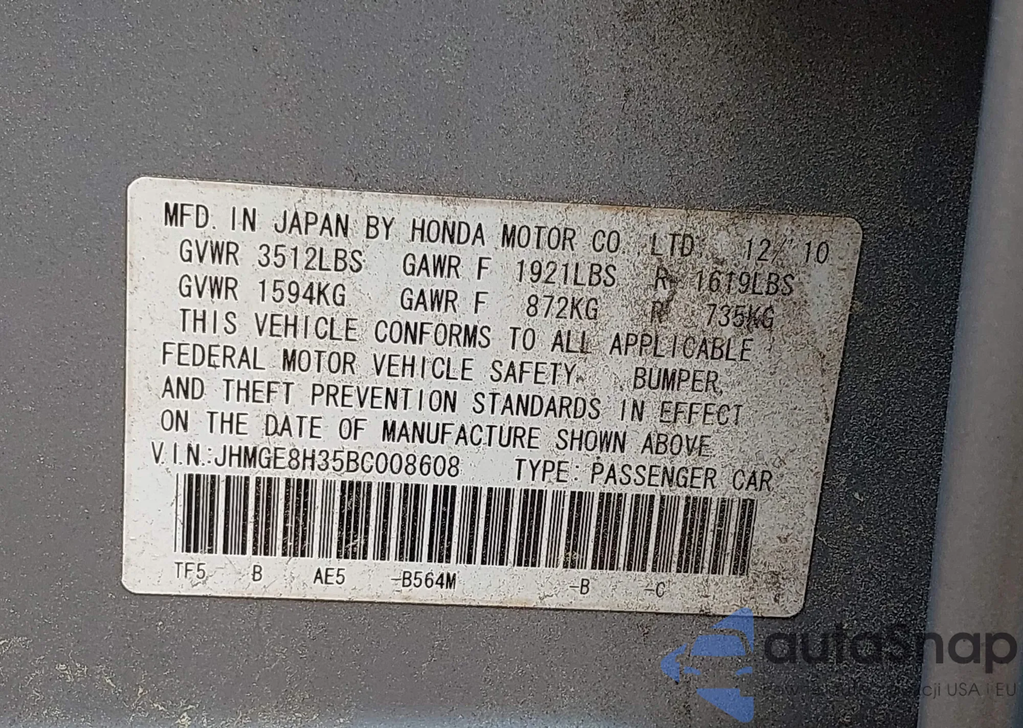 • VIN JHMGE8H35BC008608