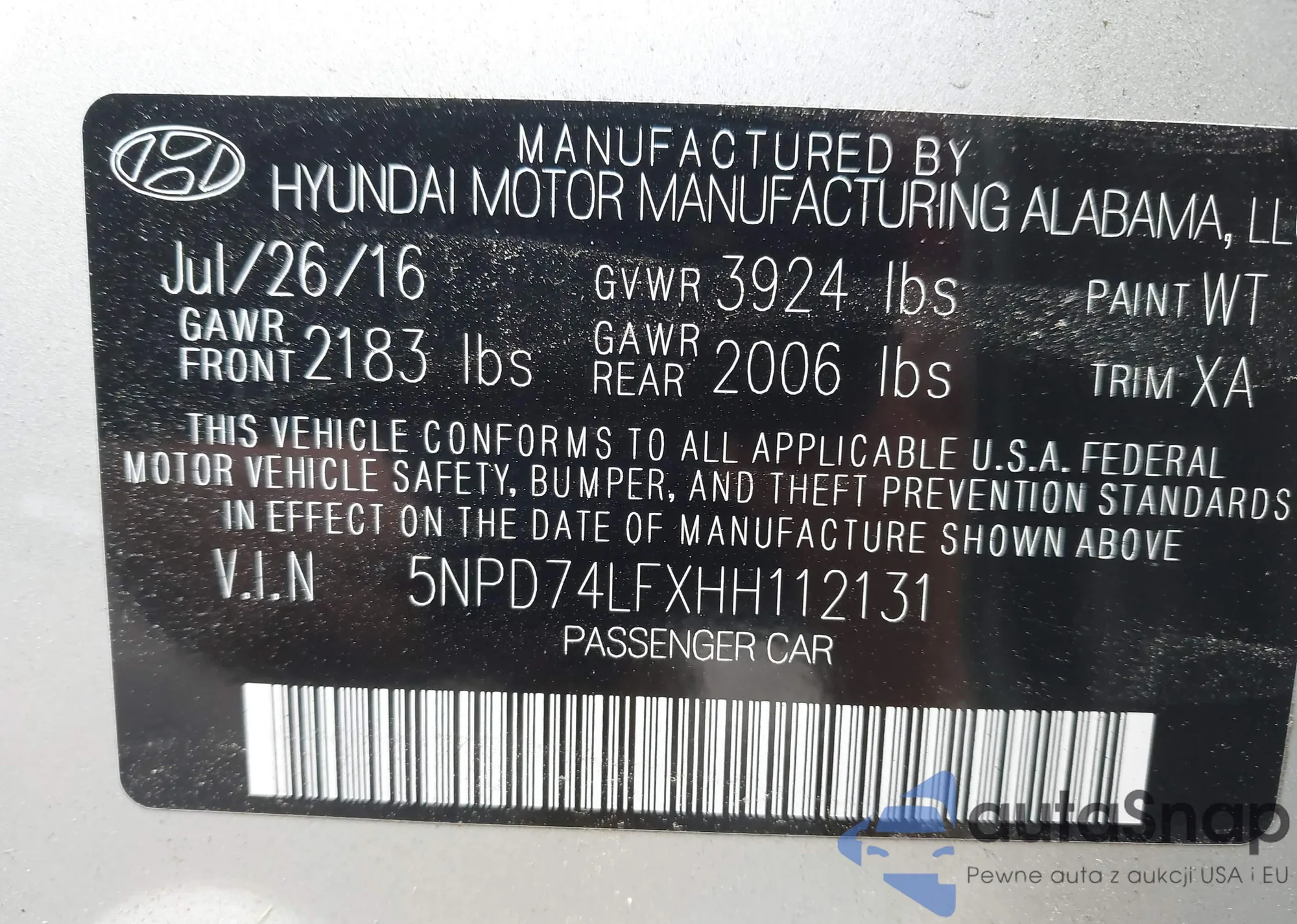LOT: 42724086 VIN: 5NPD74LFXHH112131