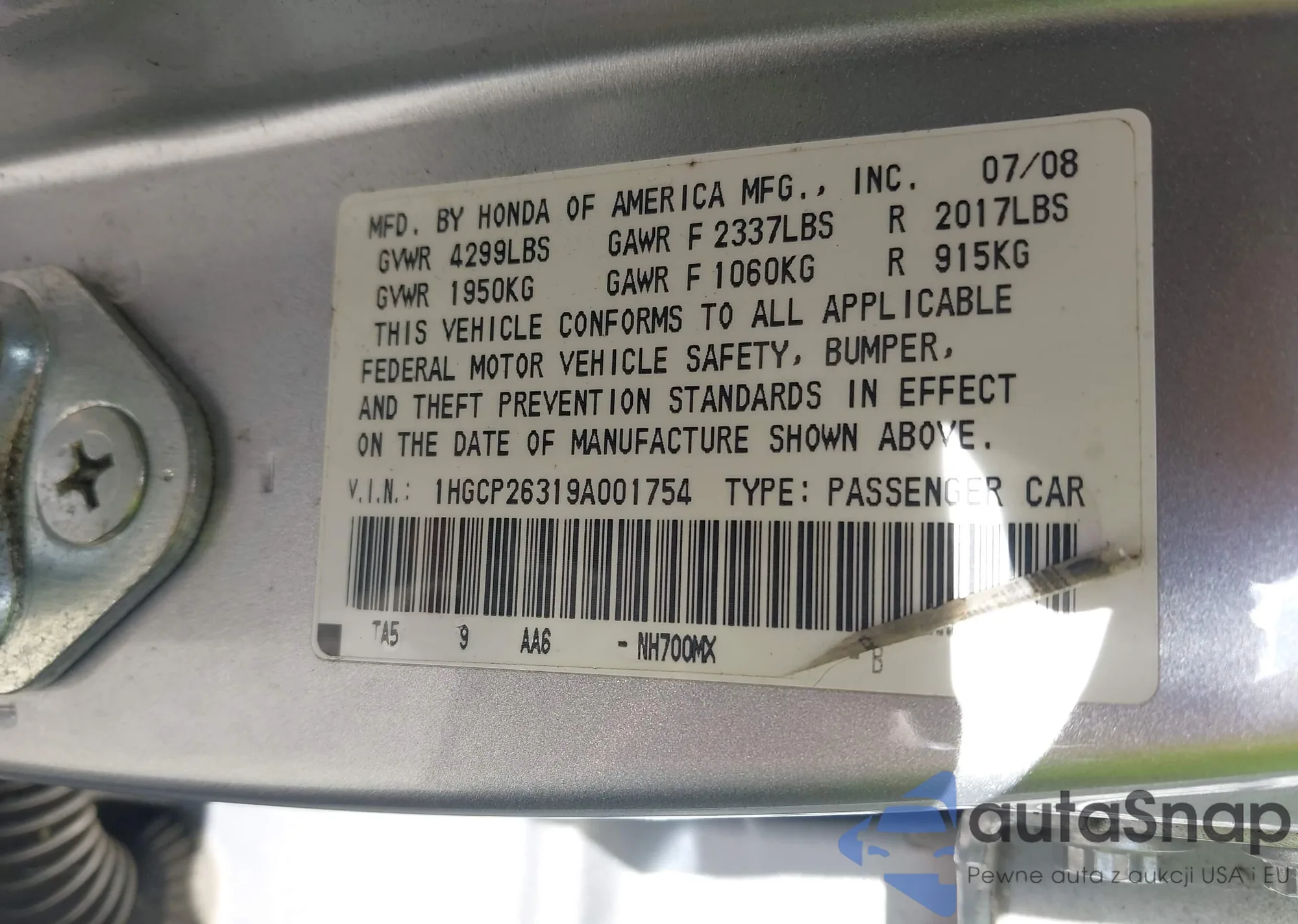 LOT: 42665889 VIN: 1HGCP26319A001754