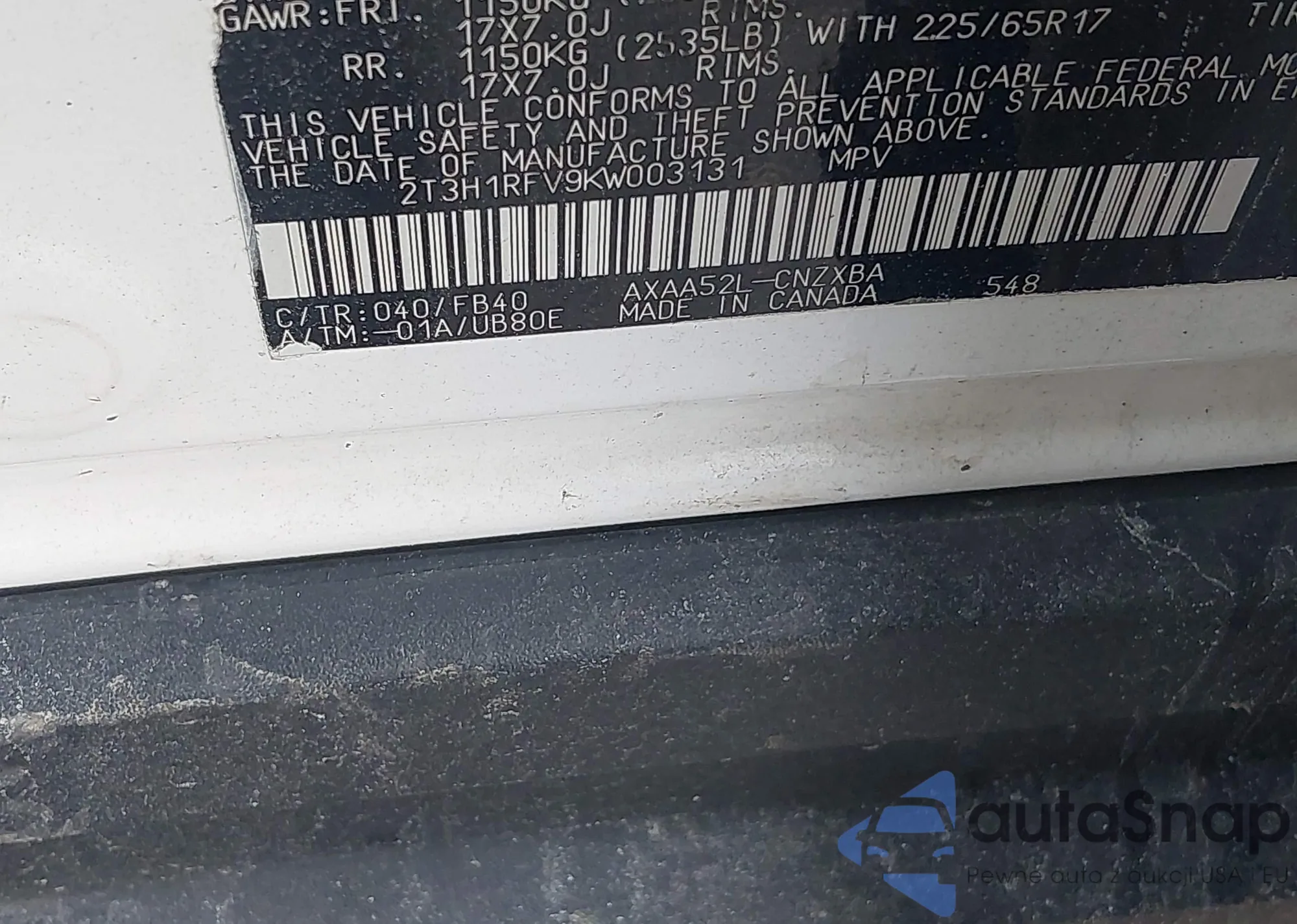 • VIN 2T3H1RFV9KW003131