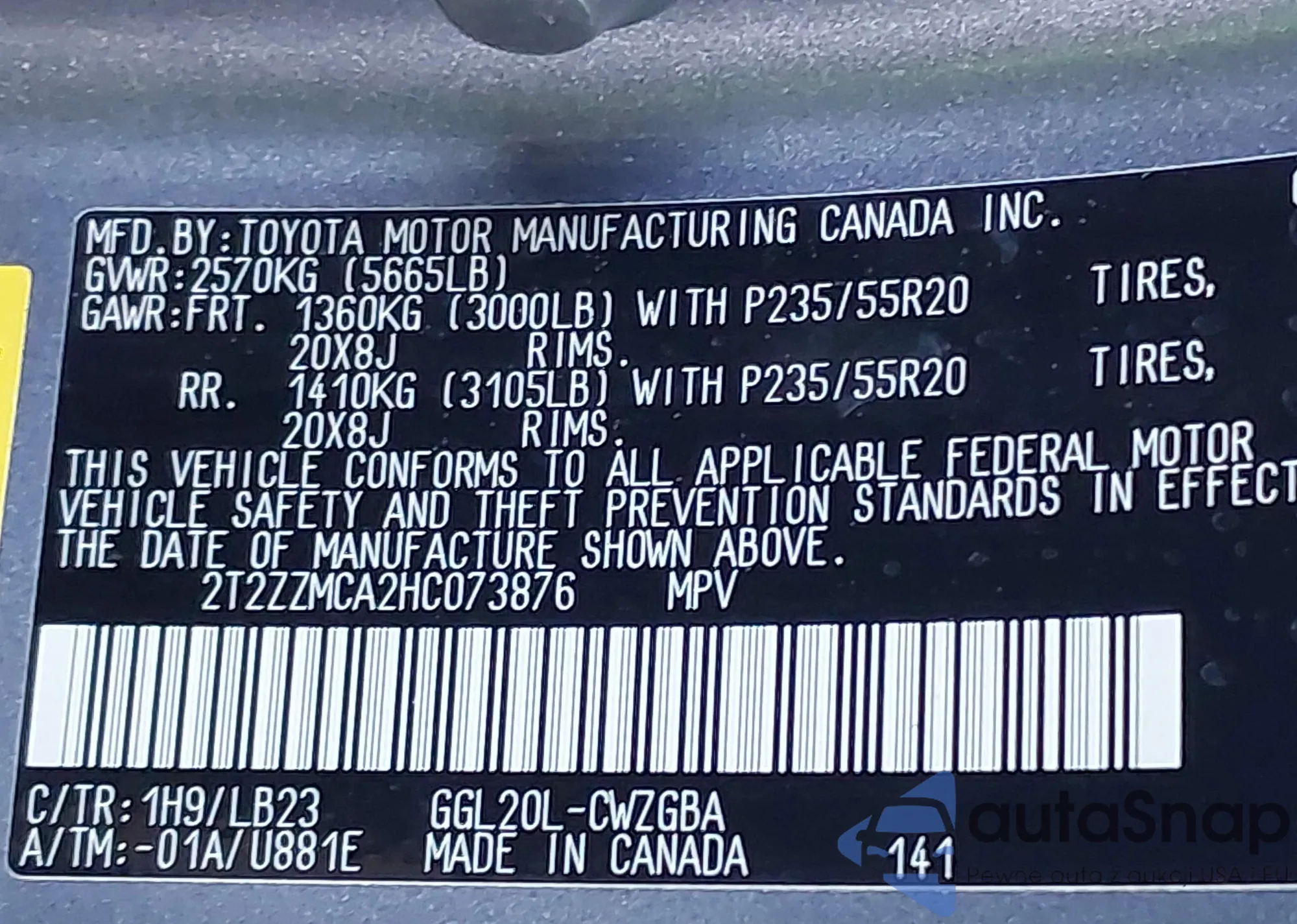 • VIN 2T2ZZMCA2HC073876