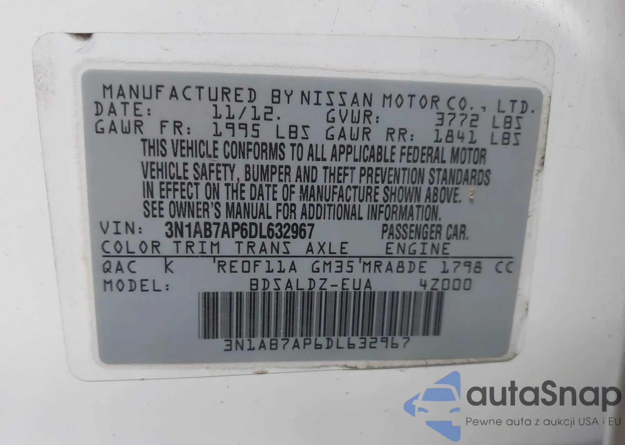 • VIN 3N1AB7AP6DL632967