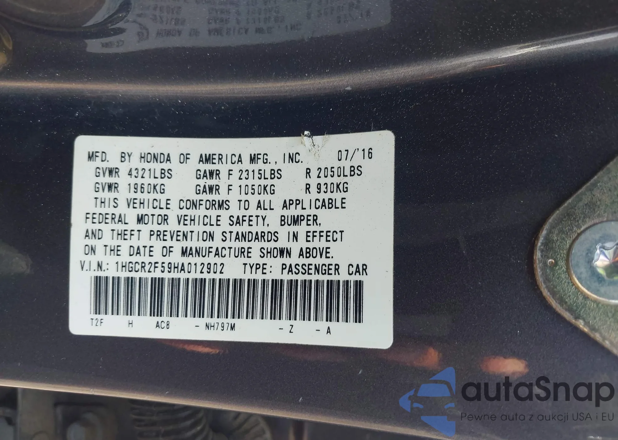LOT: 42680245 VIN: 1HGCR2F59HA012902