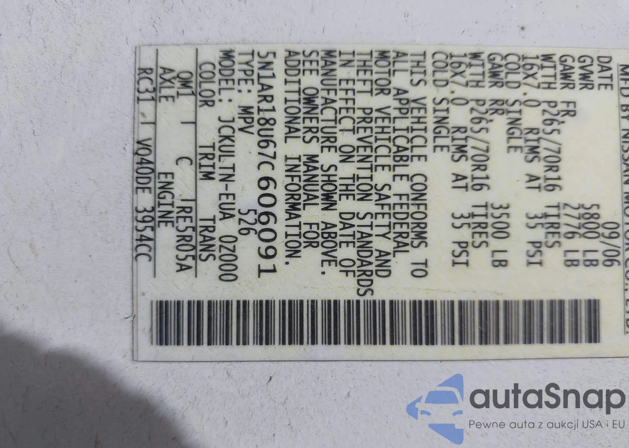 • VIN 5N1AR18U67C606091