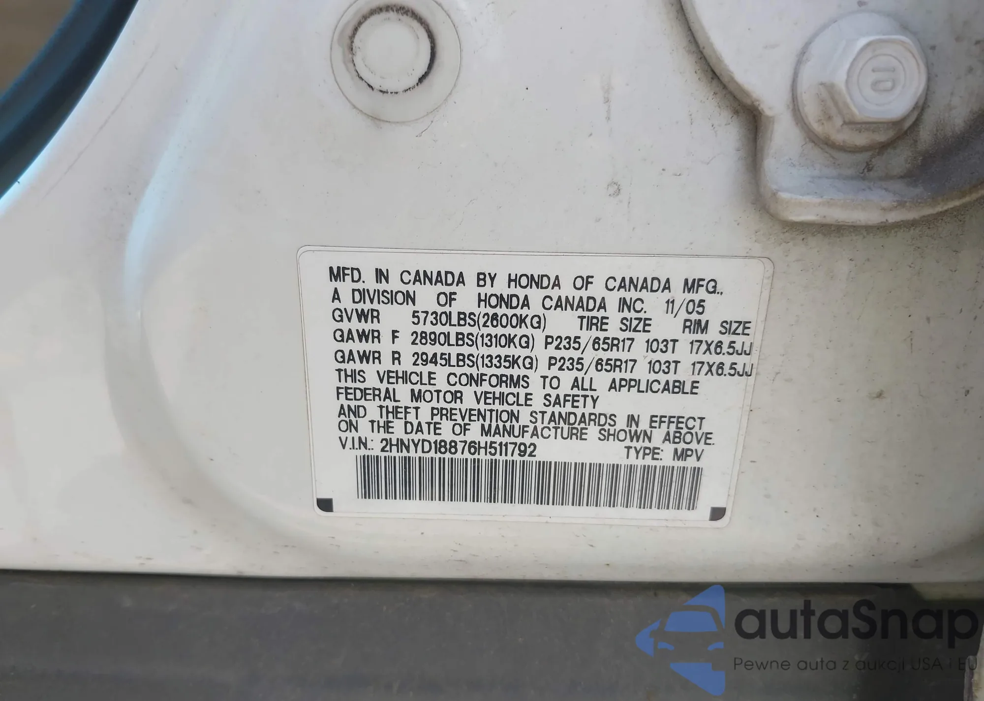 LOT: 42689507 VIN: 2HNYD18876H511792