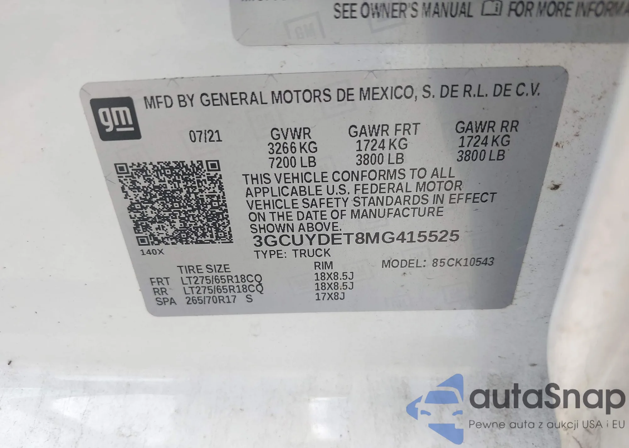 LOT: 42580044 VIN: 3GCUYDET8MG415525