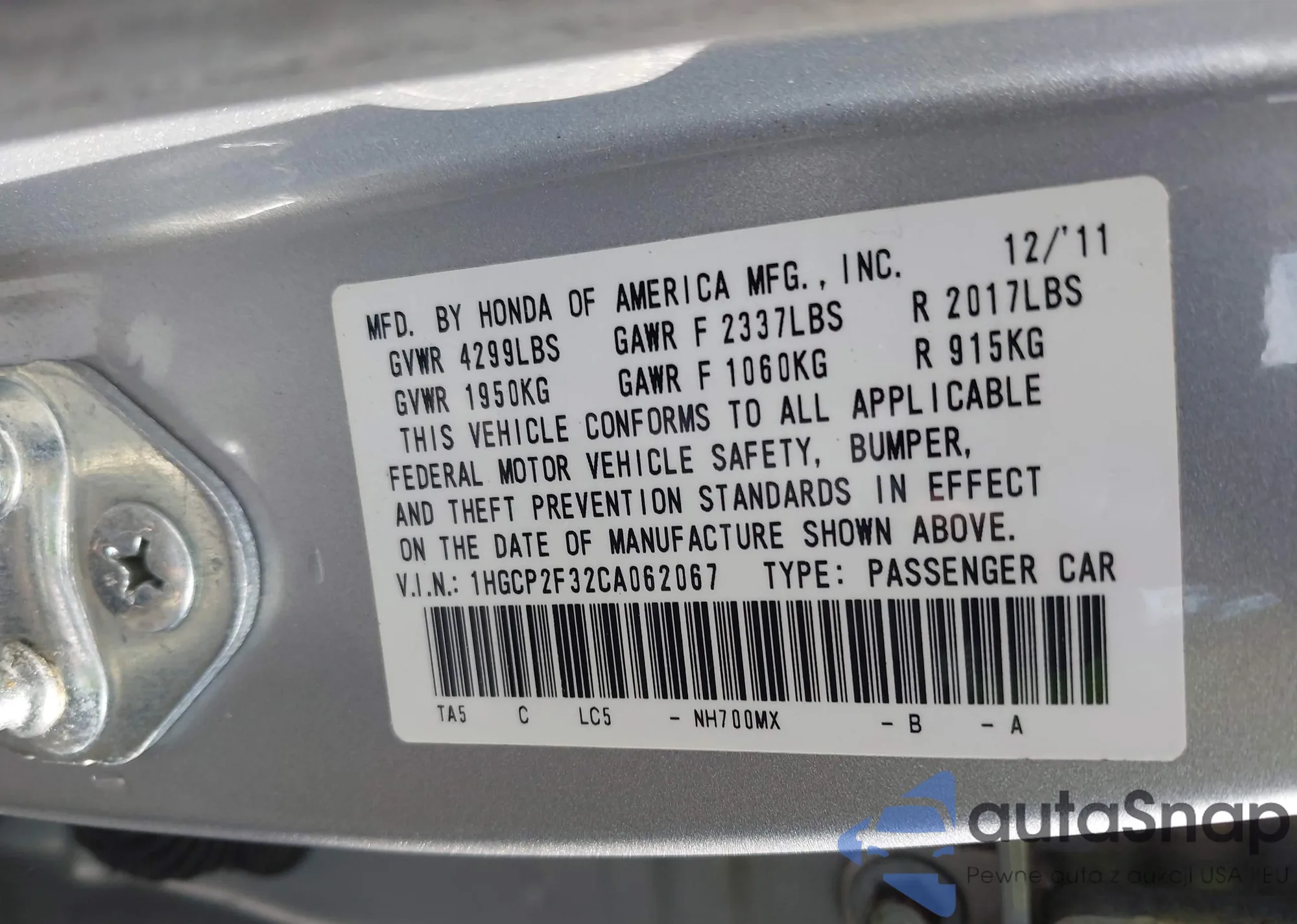 • VIN 1HGCP2F32CA062067