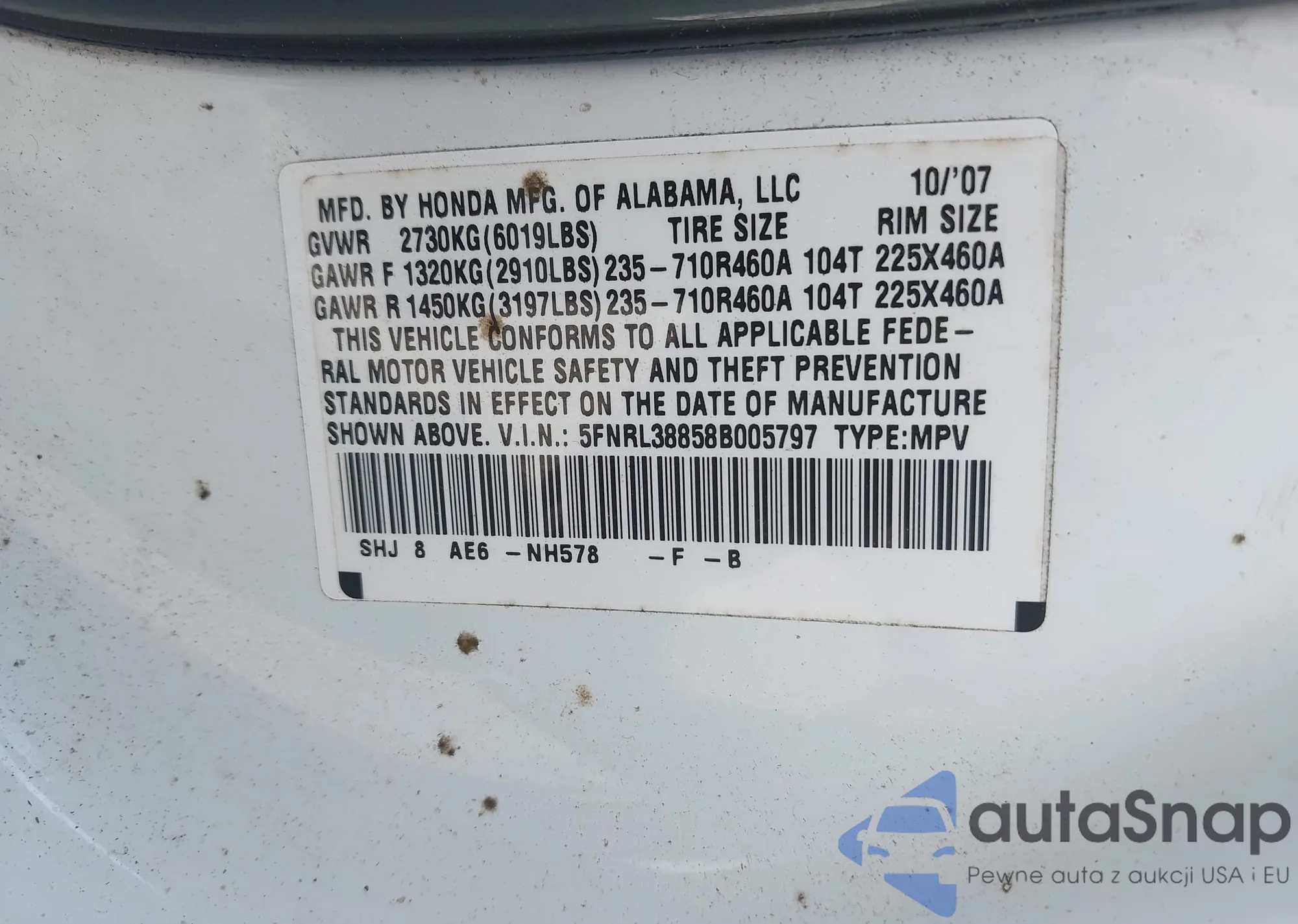 • VIN 5FNRL38858B005797