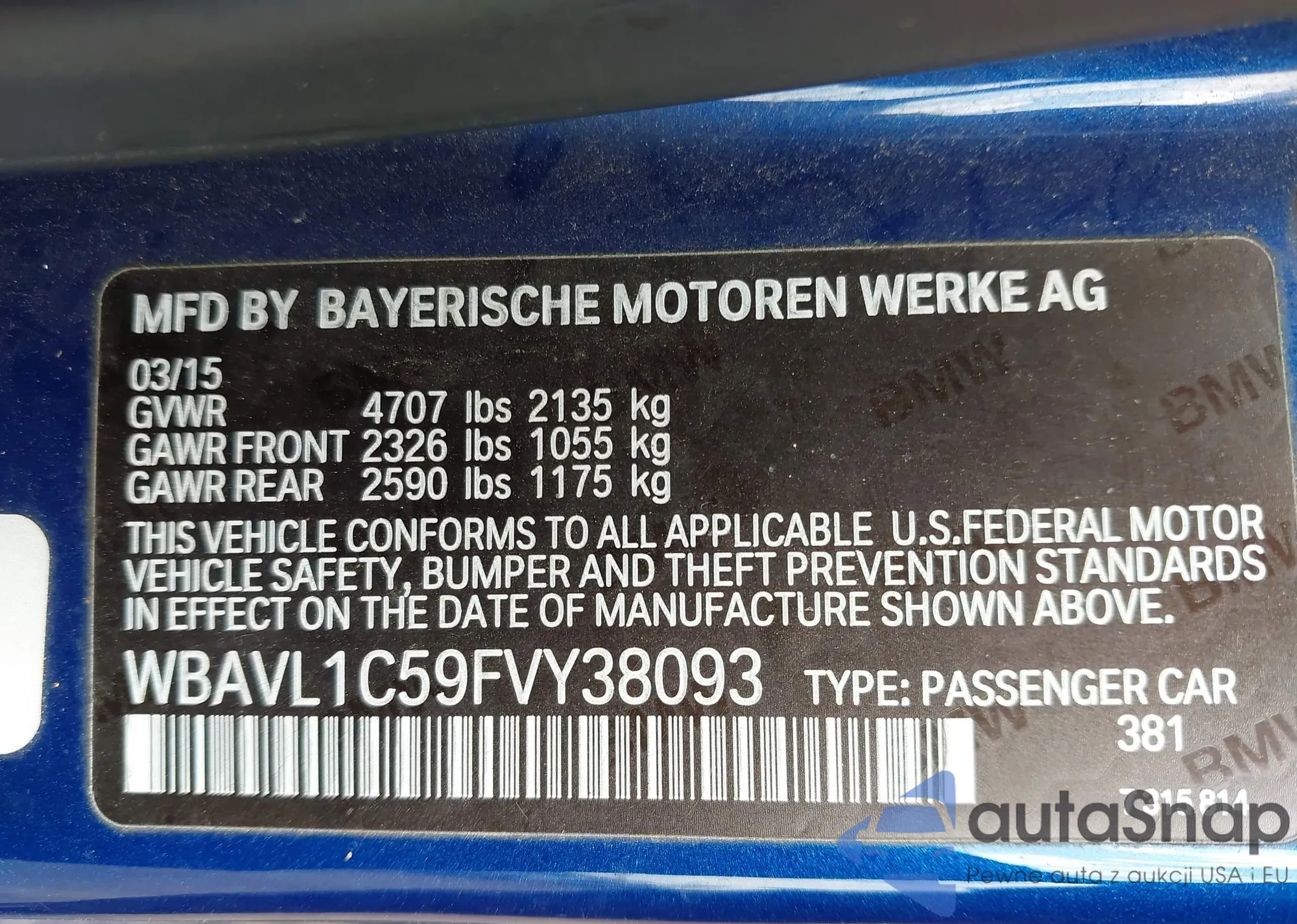 LOT: 42686339 VIN: WBAVL1C59FVY38093