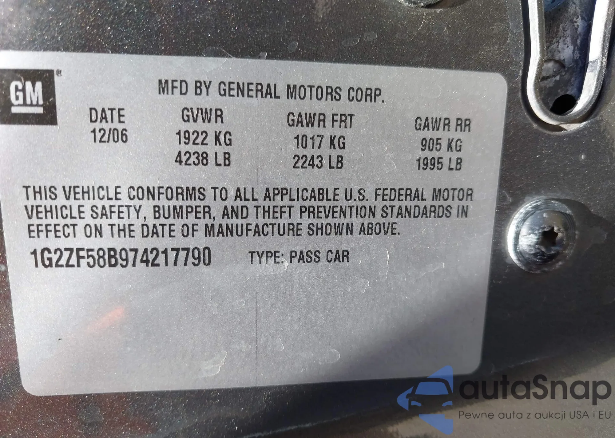 LOT: 42599255 VIN: 1G2ZF58B974217790