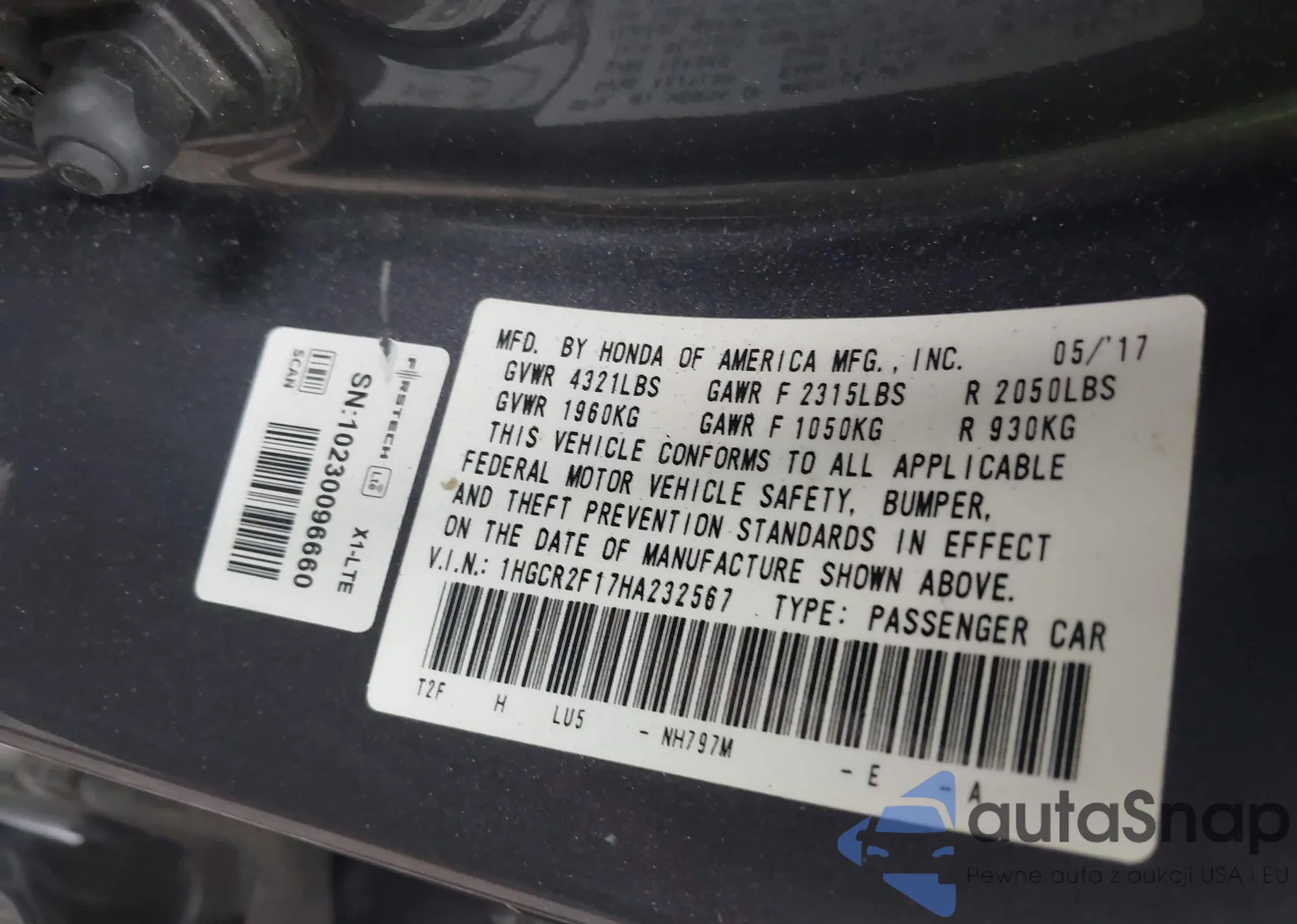LOT: 42576433 VIN: 1HGCR2F17HA232567