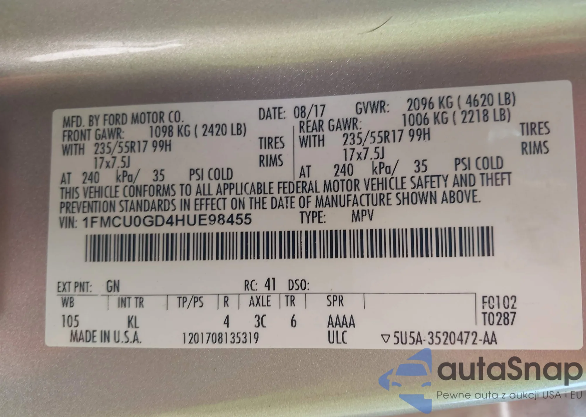 LOT: 41855755 VIN: 1FMCU0GD4HUE98455