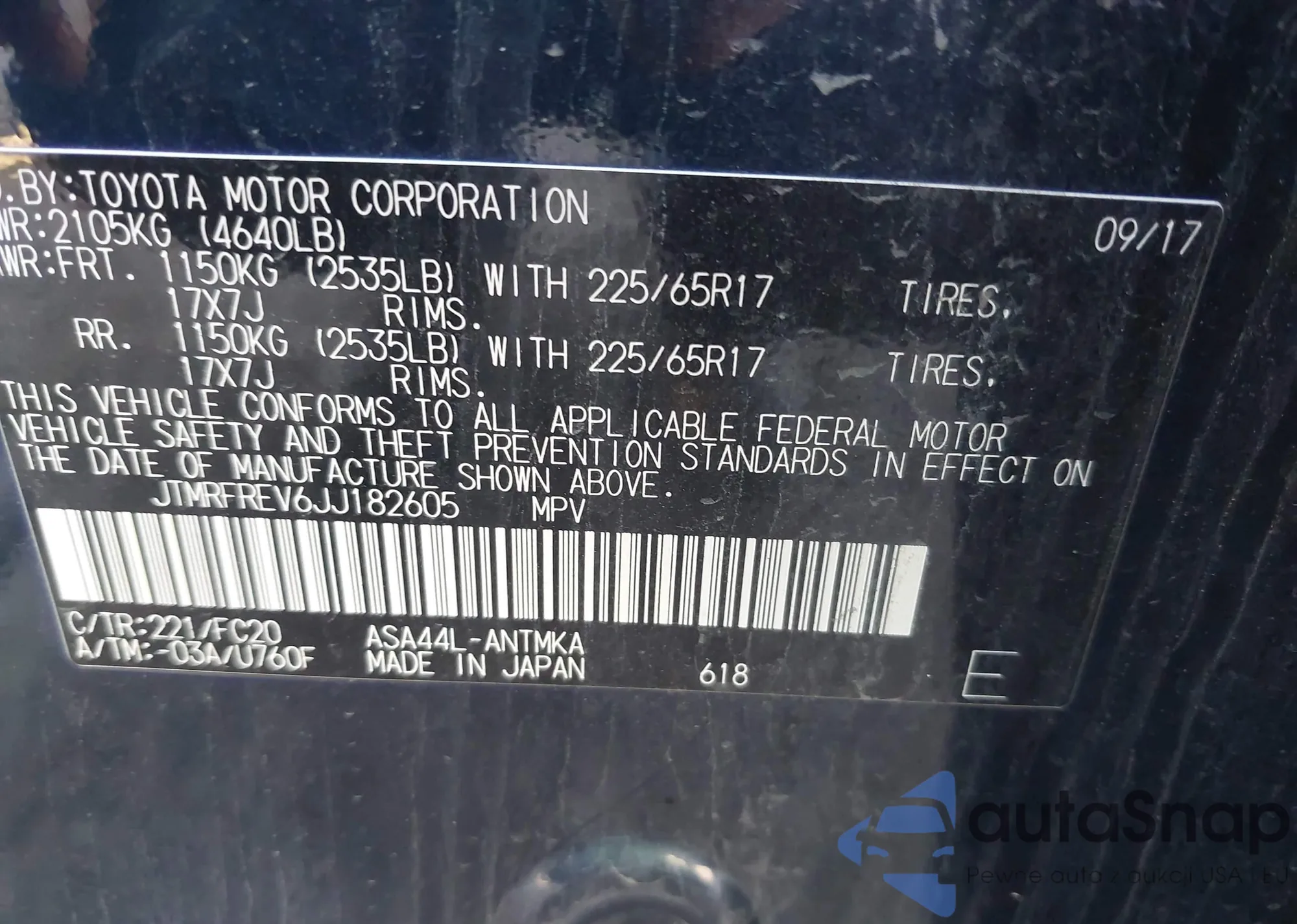 LOT: 42526662 VIN: JTMRFREV6JJ182605