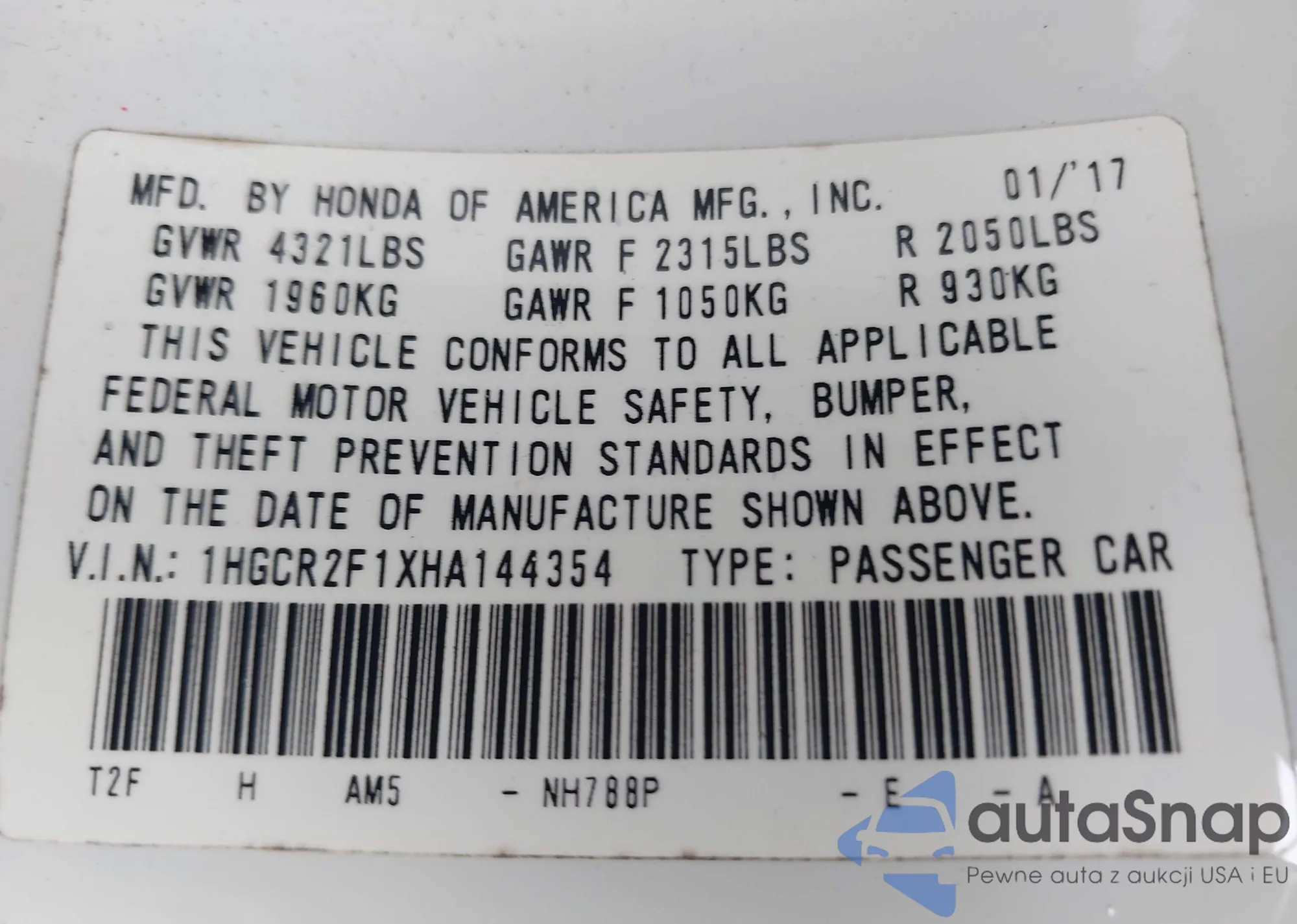 LOT: 42102034 VIN: 1HGCR2F1XHA144354