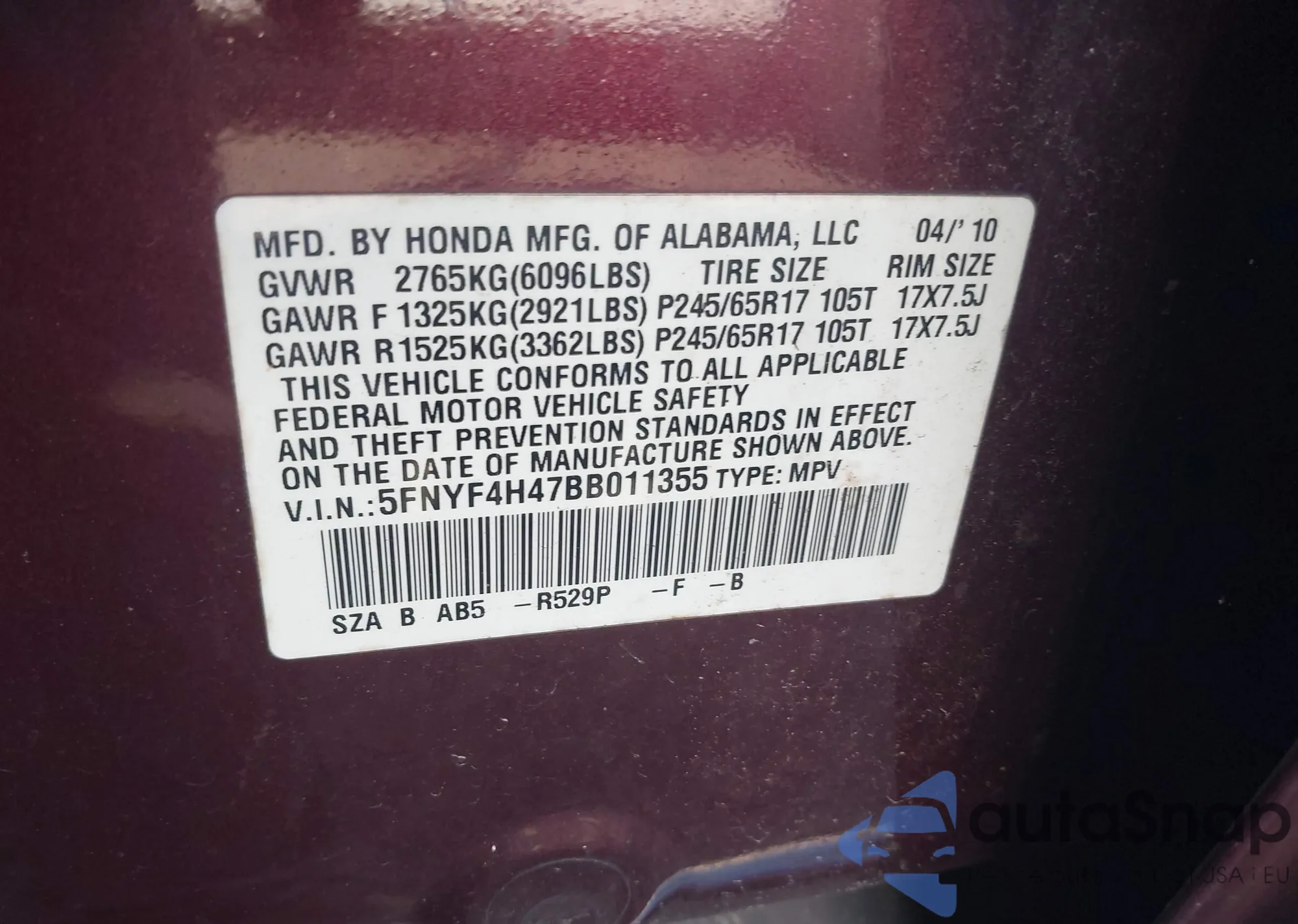 • VIN 5FNYF4H47BB011355