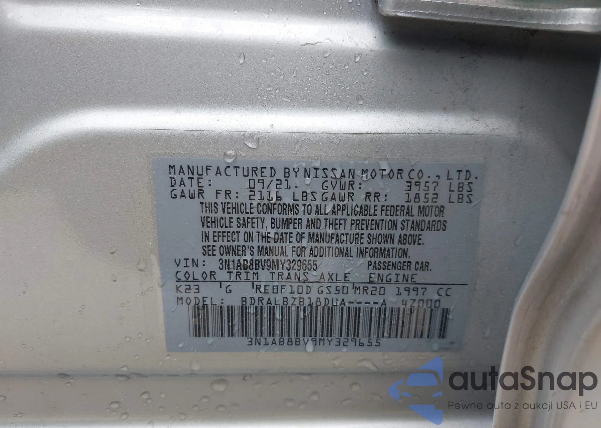 LOT: 42378561 VIN: 3N1AB8BV9MY329655