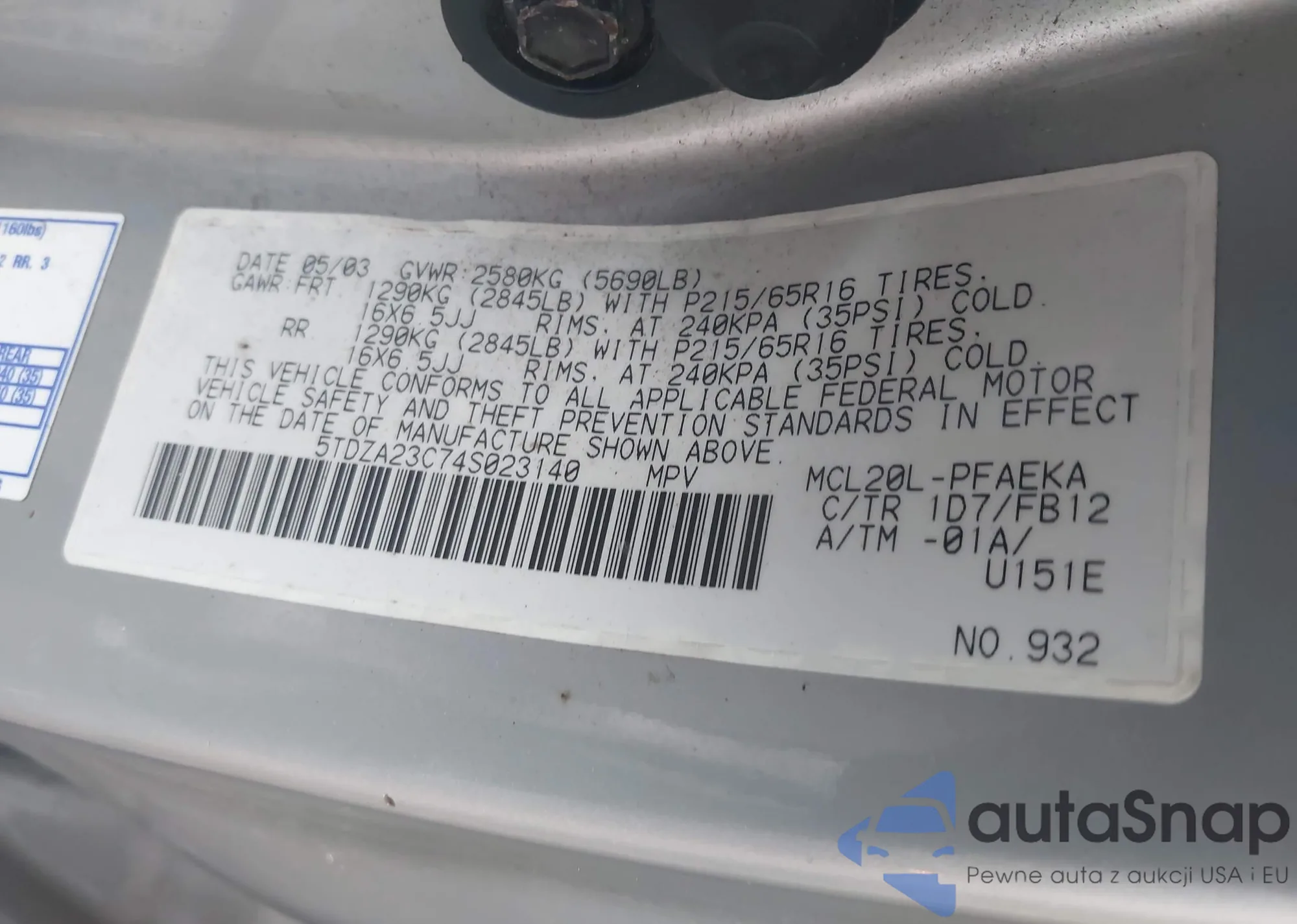 LOT: 42717604 VIN: 5TDZA23C74S023140