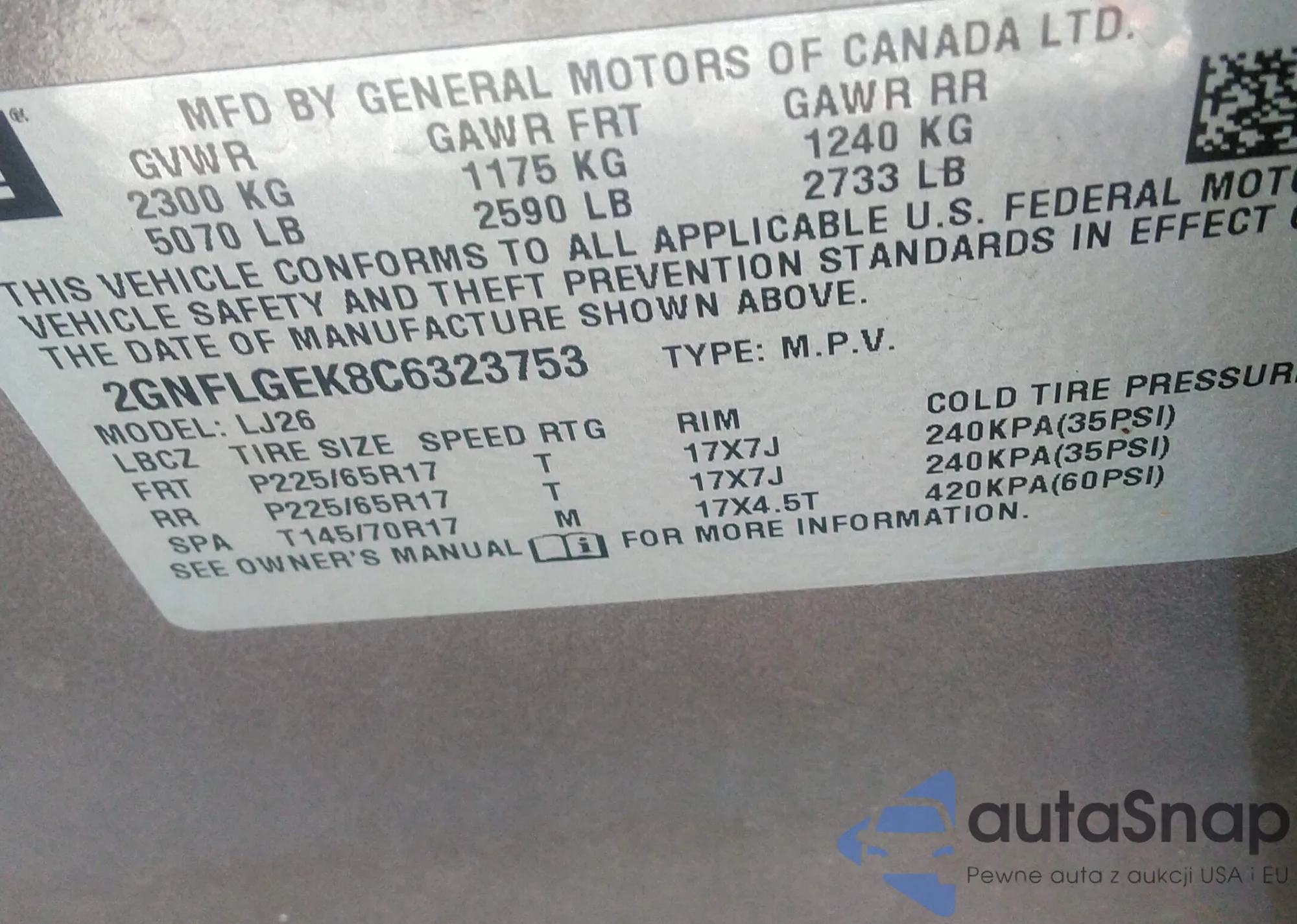 • VIN 2GNFLGEK8C6323753