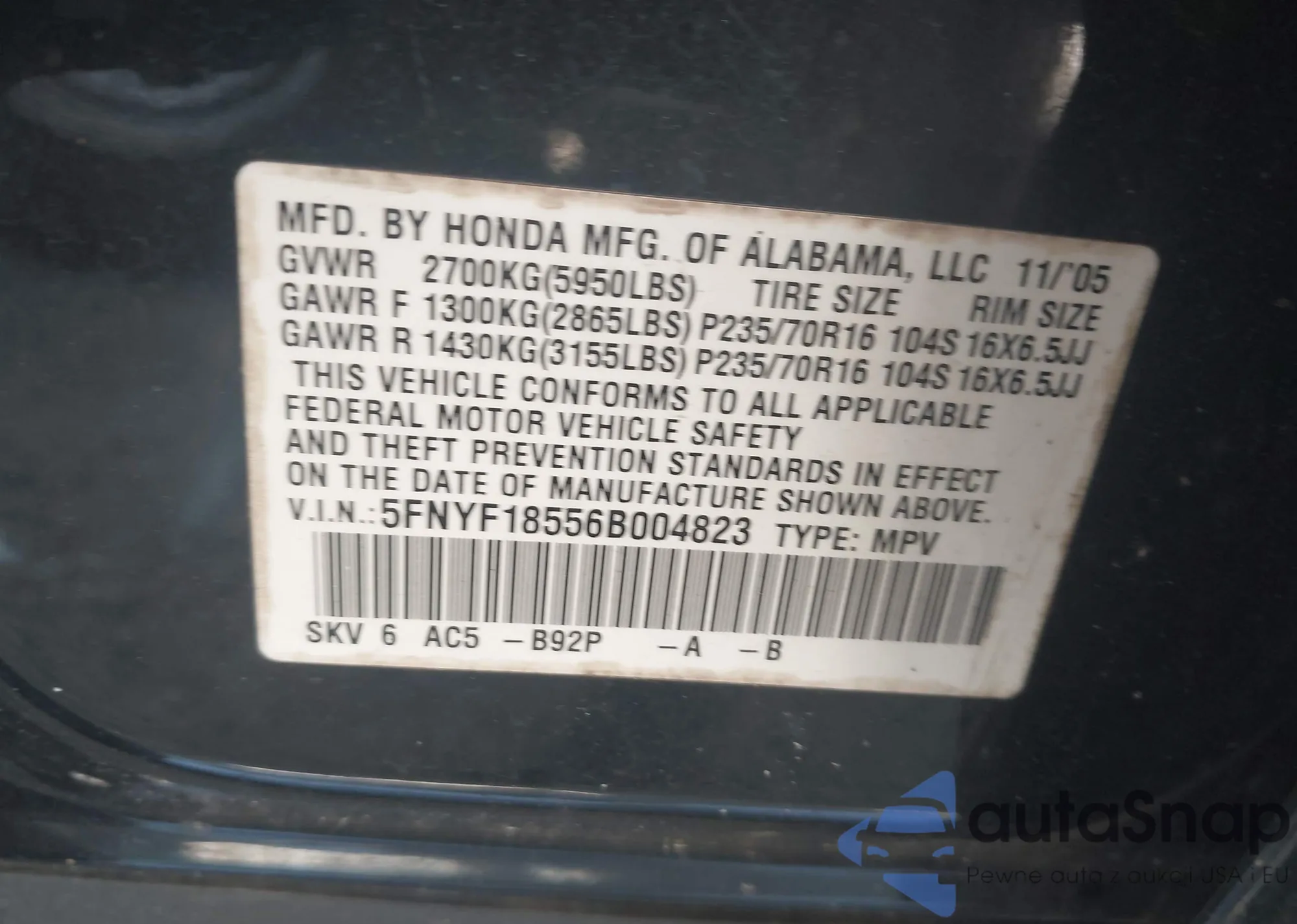 • VIN 5FNYF18556B004823