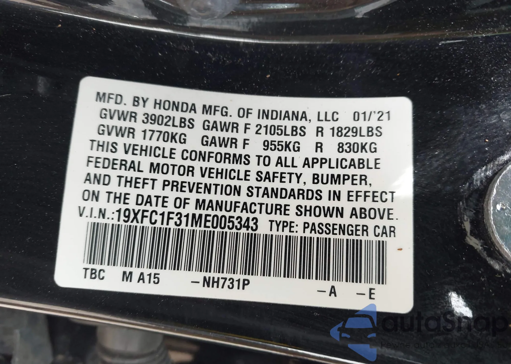 • VIN 19XFC1F31ME005343