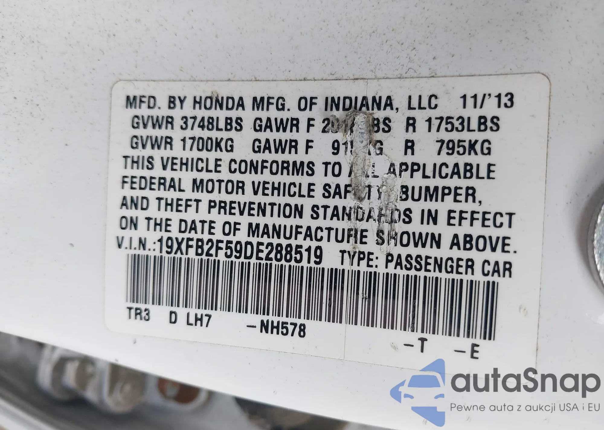 LOT: 42389231 VIN: 19XFB2F59DE288519