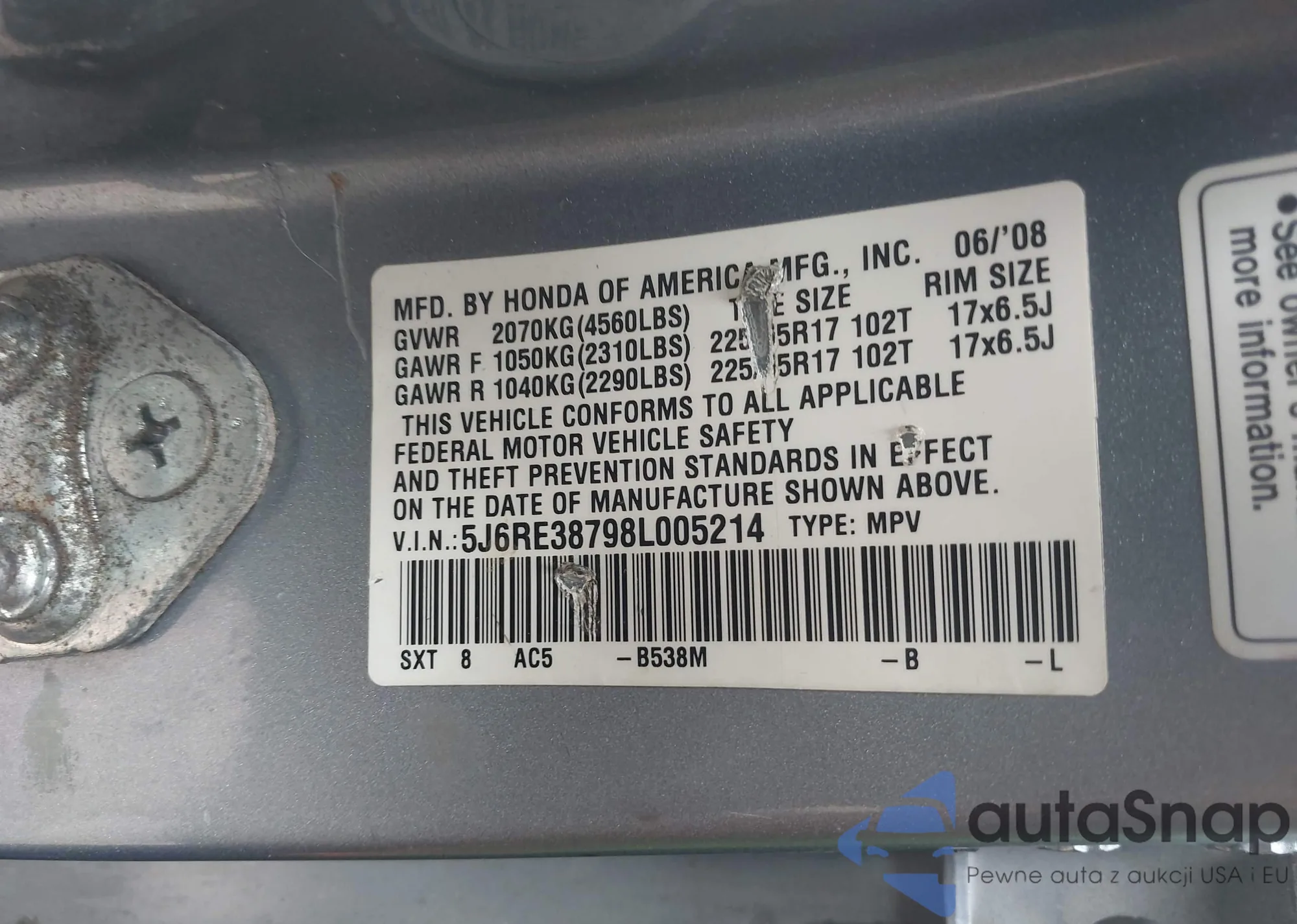 LOT: 42440400 VIN: 5J6RE38798L005214