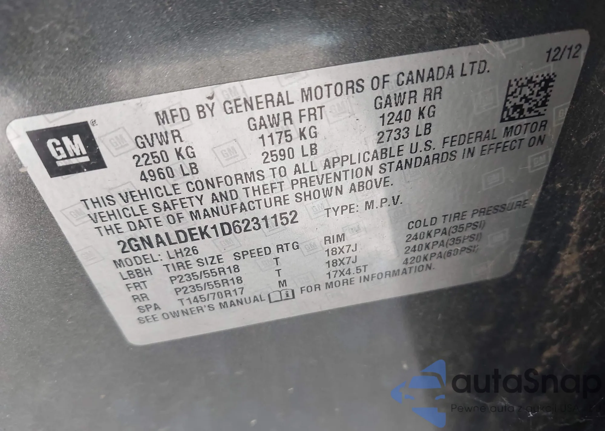 LOT: 42311202 VIN: 5J8TC2H68KL001165