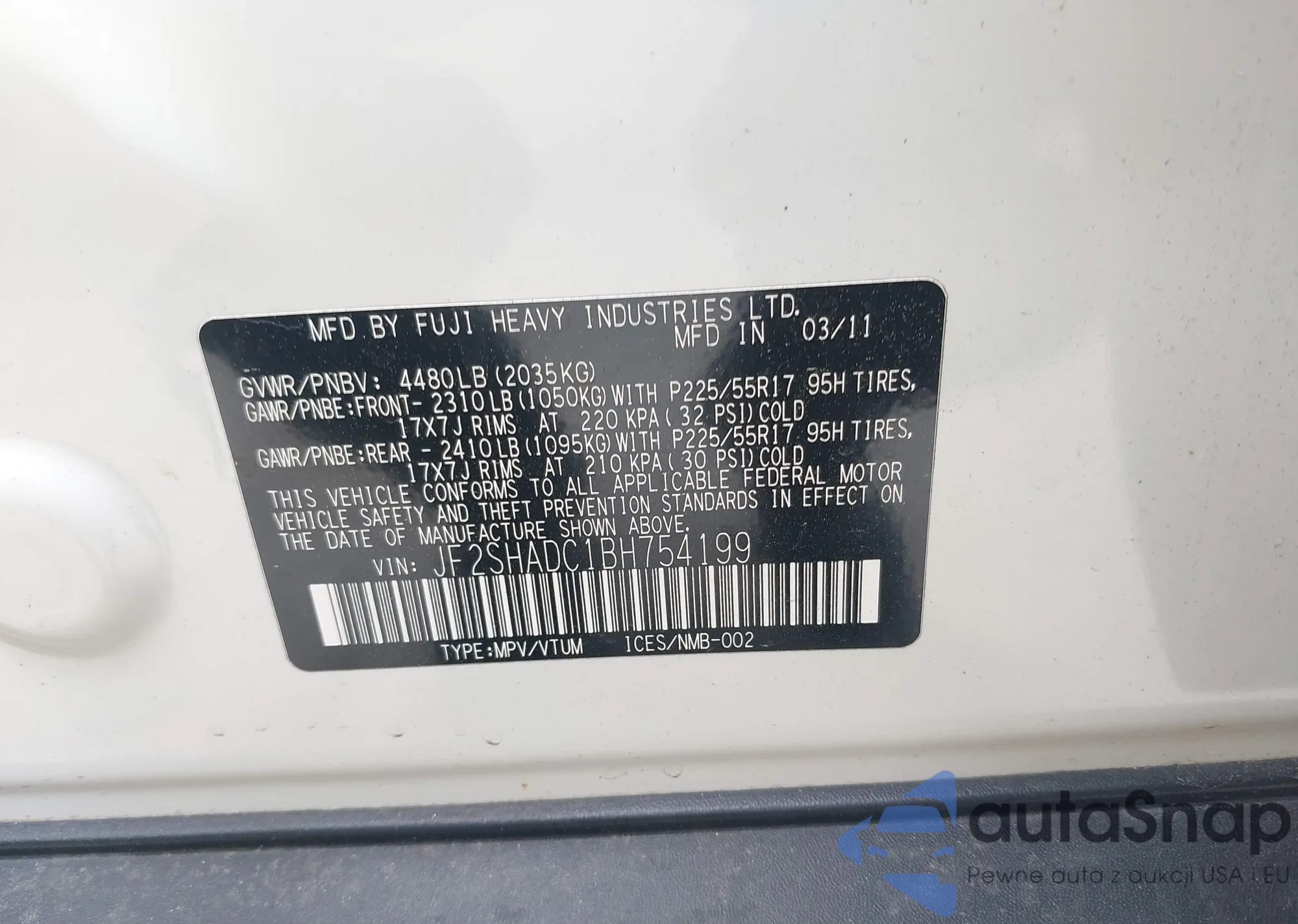 LOT: 42546845 VIN: JF2SHADC1BH754199