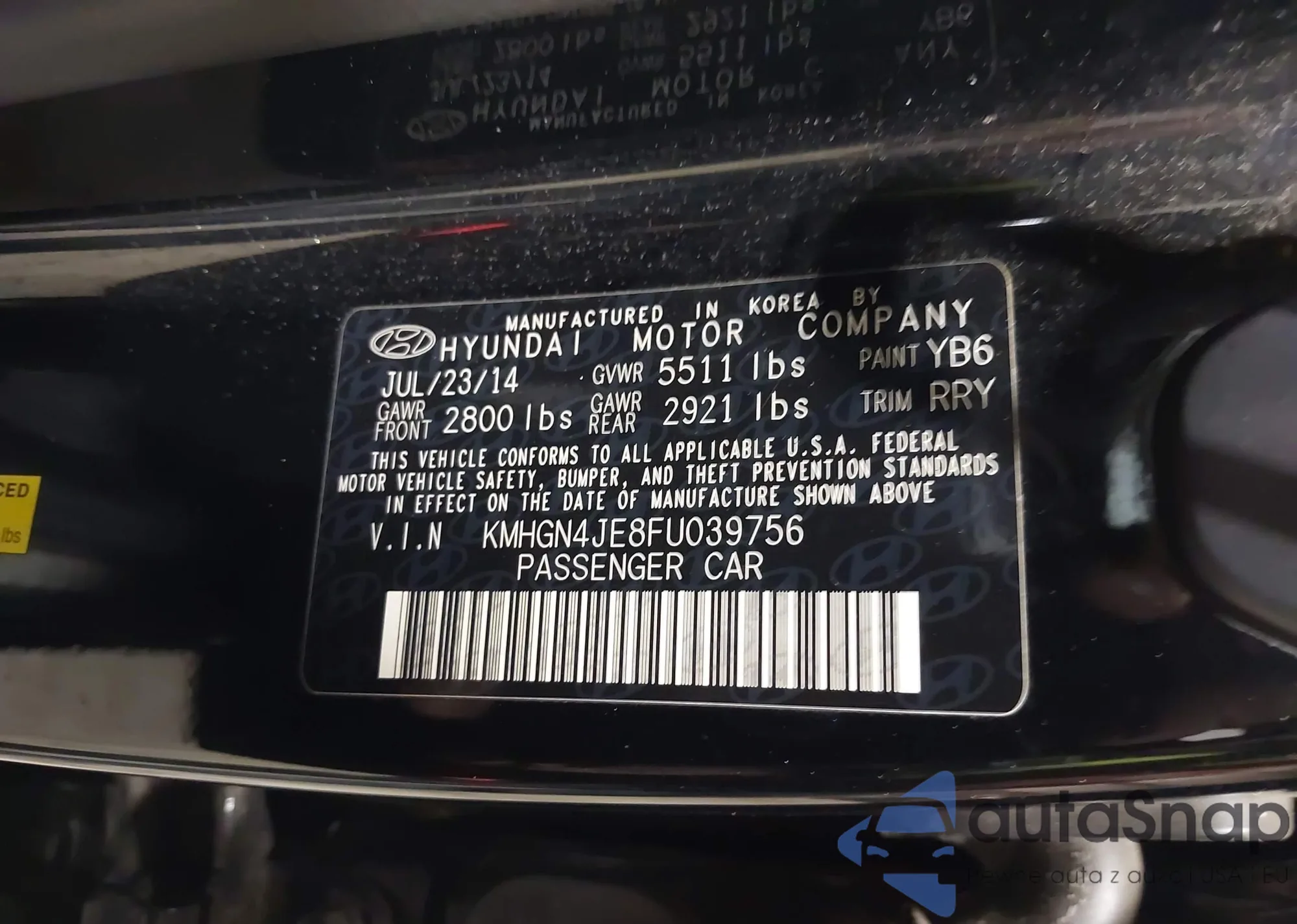 LOT: 41980197 VIN: KMHGN4JE8FU039756