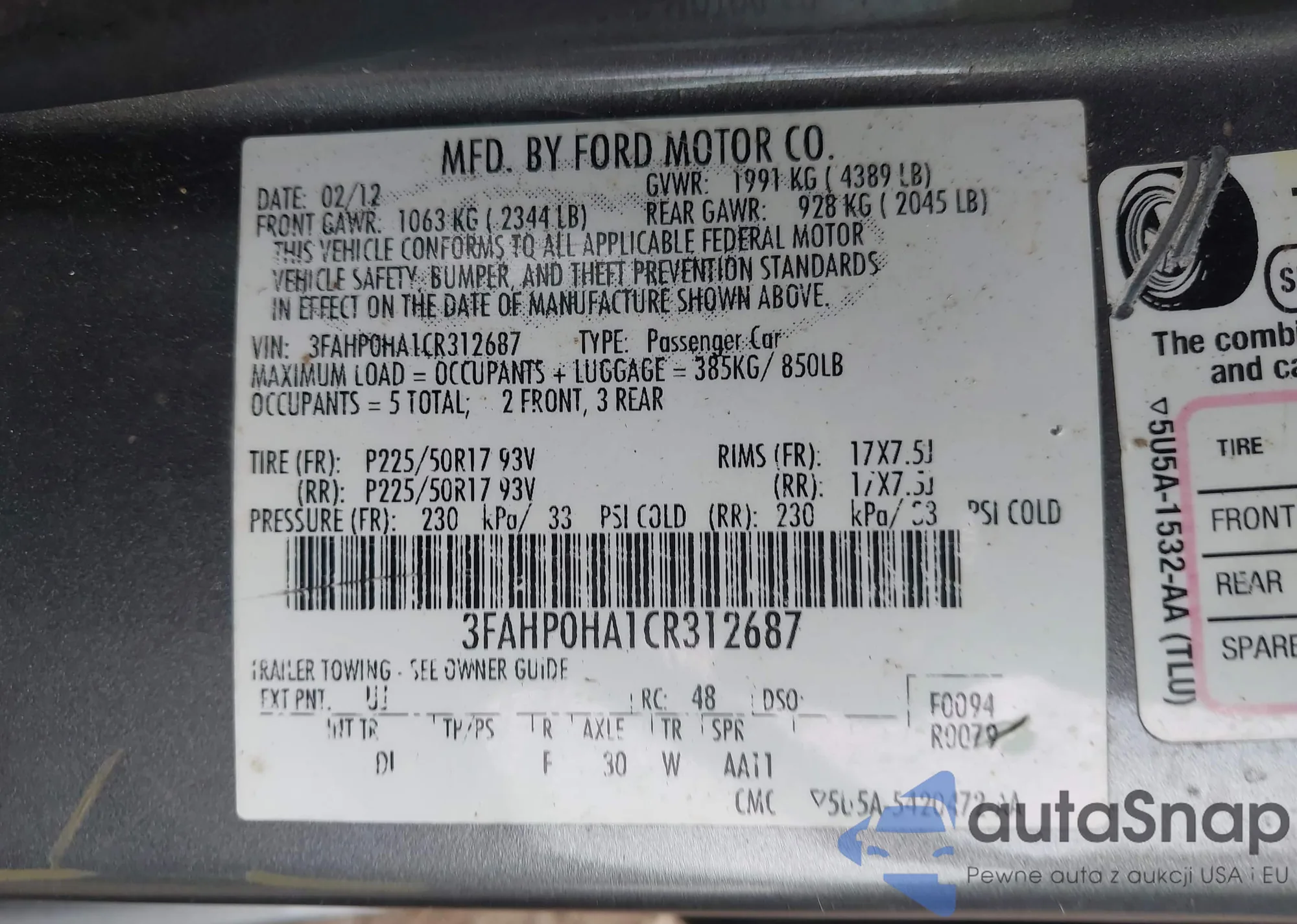 LOT: 42342538 VIN: 3FAHP0HA1CR312687