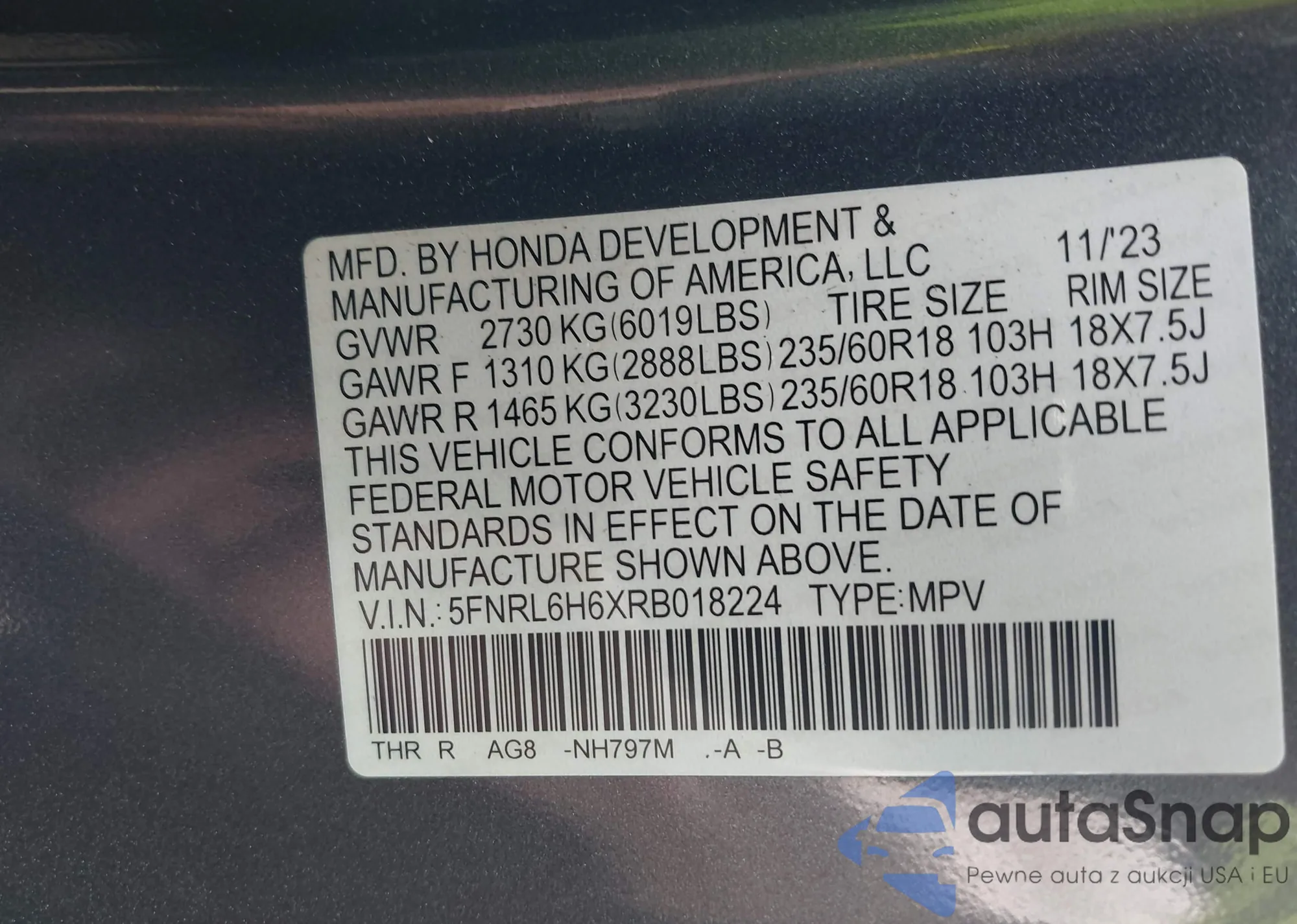 • VIN 5FNRL6H6XRB018224