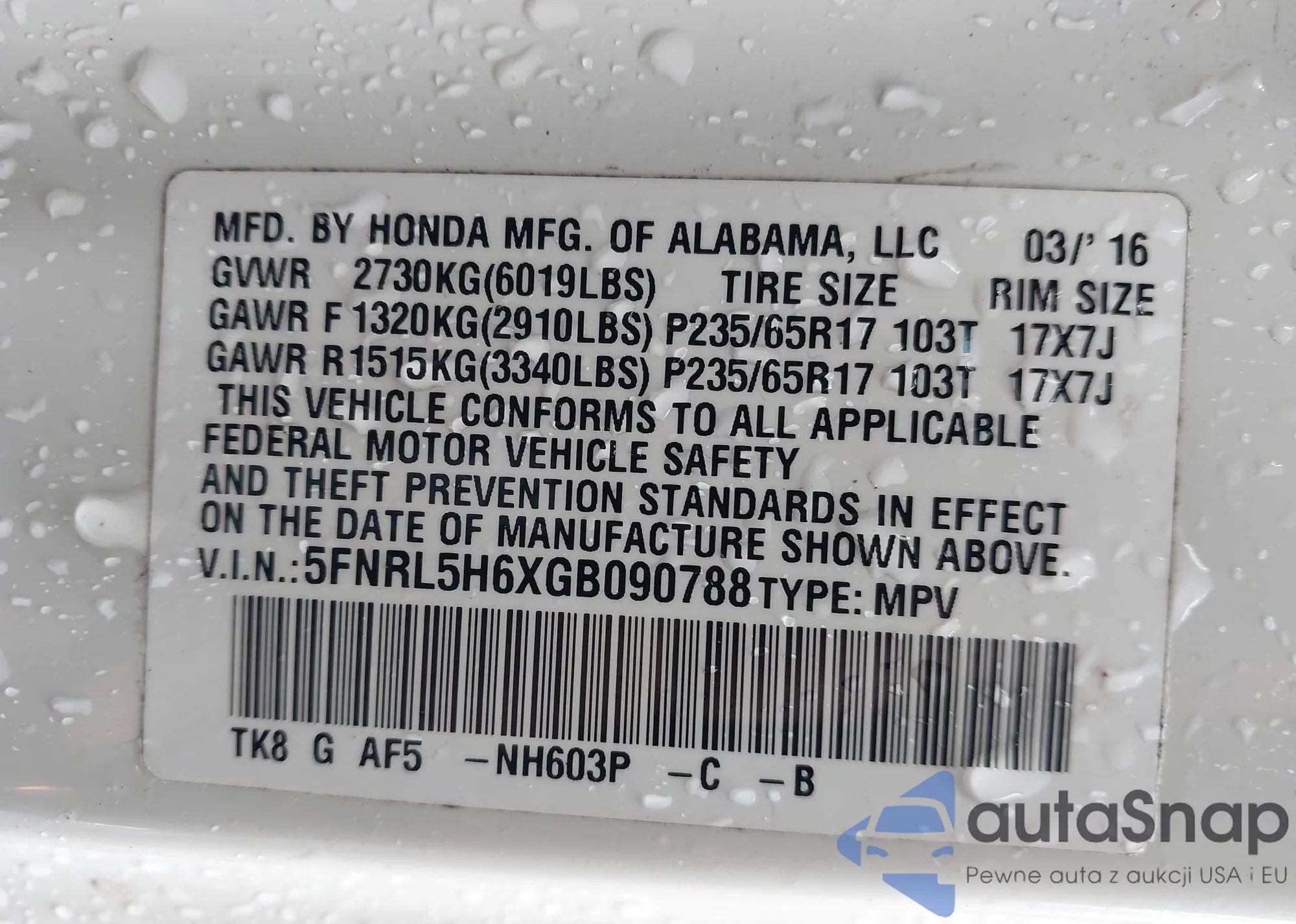 • VIN 5FNRL5H6XGB090788