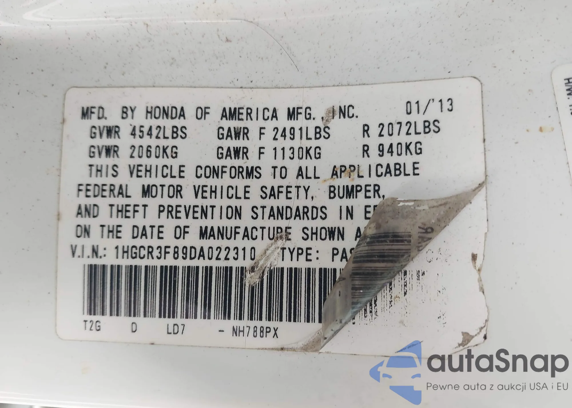 LOT: 41769514 VIN: 1HGCR3F89DA022310