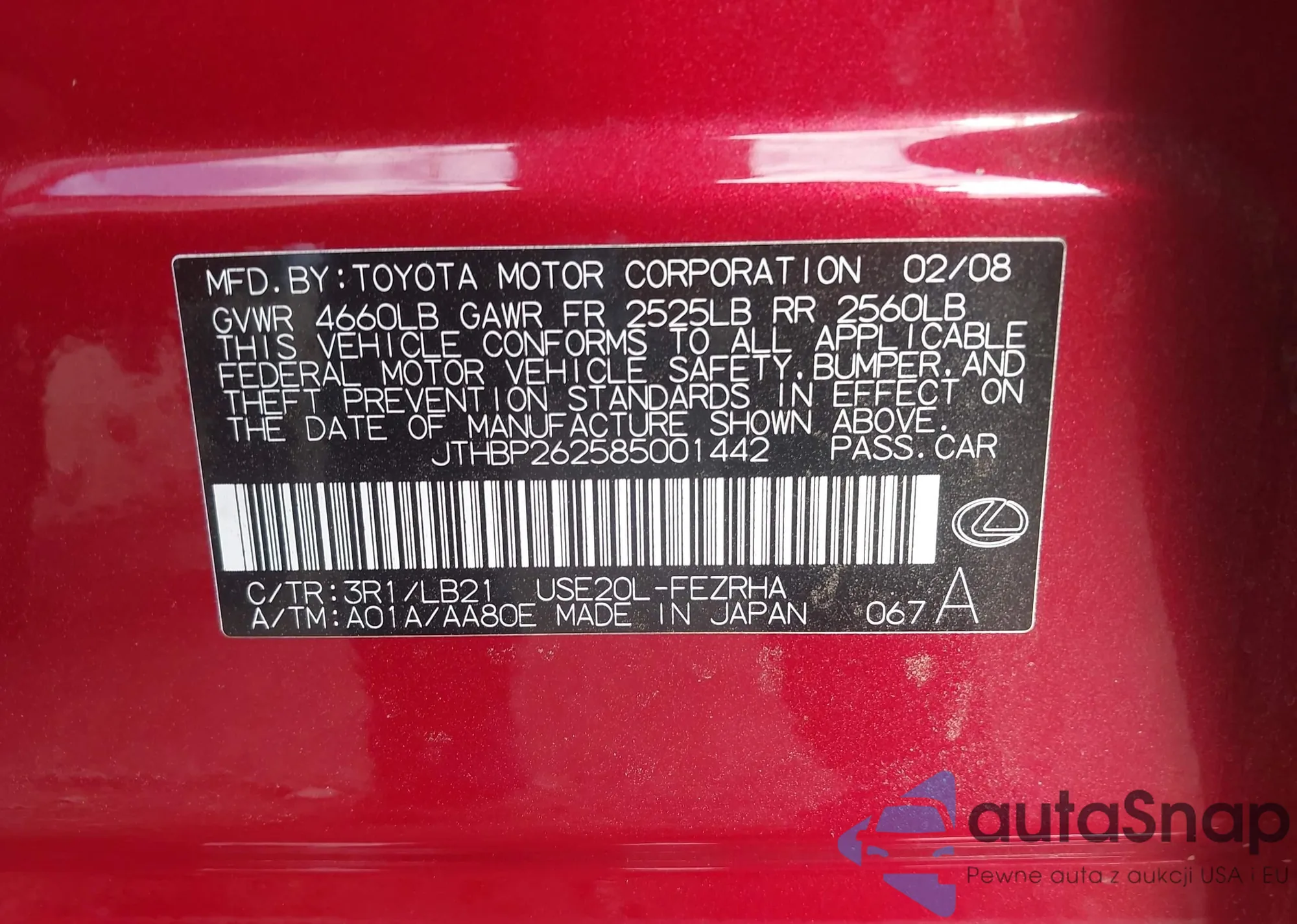 LOT: 42549906 VIN: JTHBP262585001442