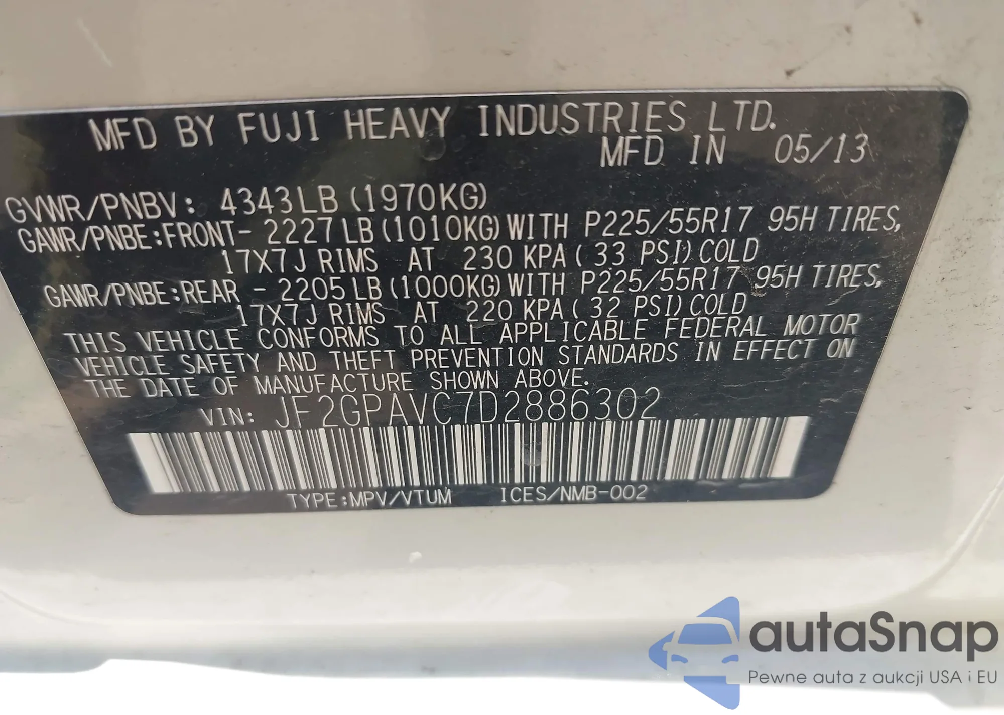 LOT: 42563472 VIN: JF2GPAVC7D2886302