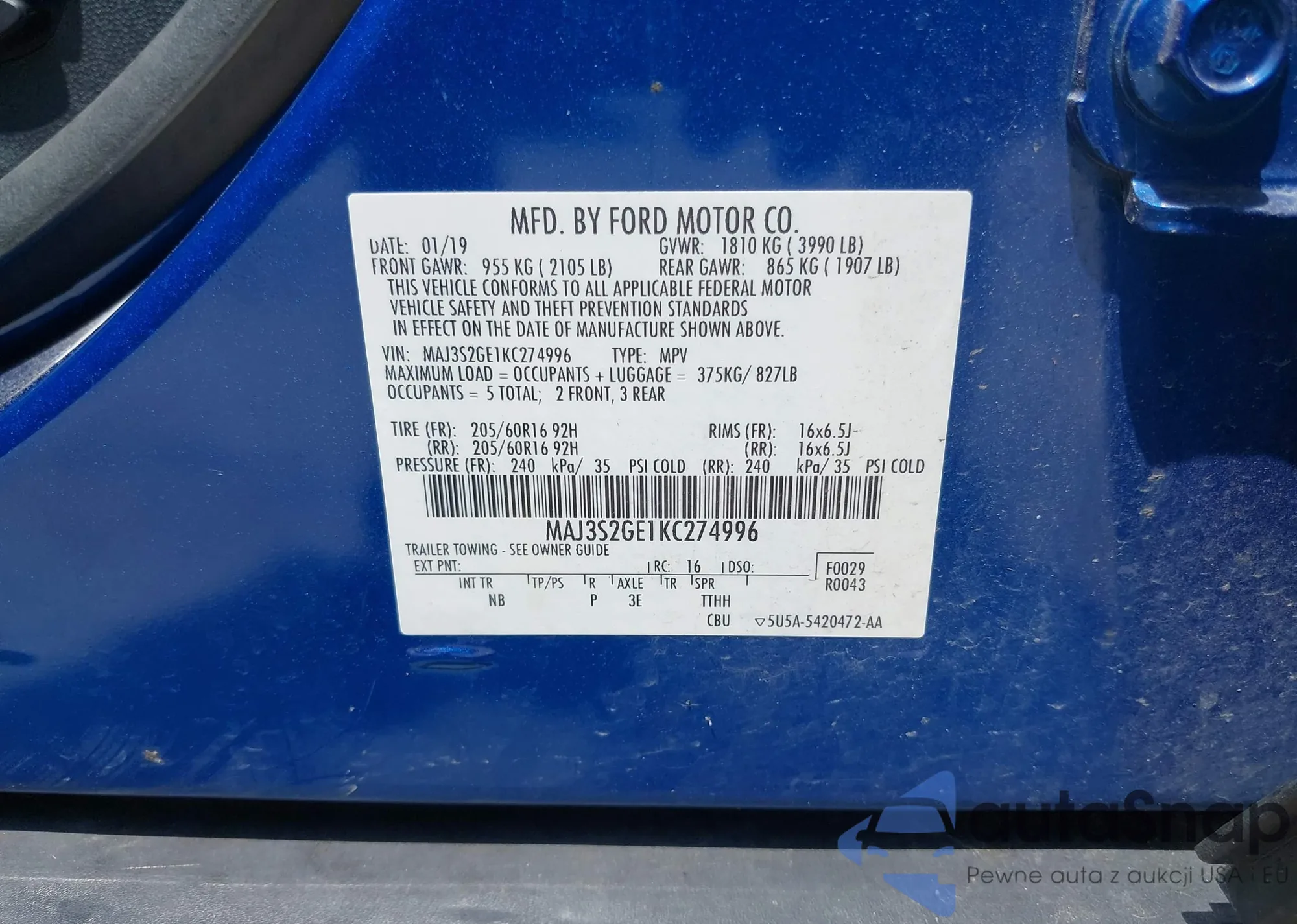 LOT: 42558411 VIN: MAJ3S2GE1KC274996