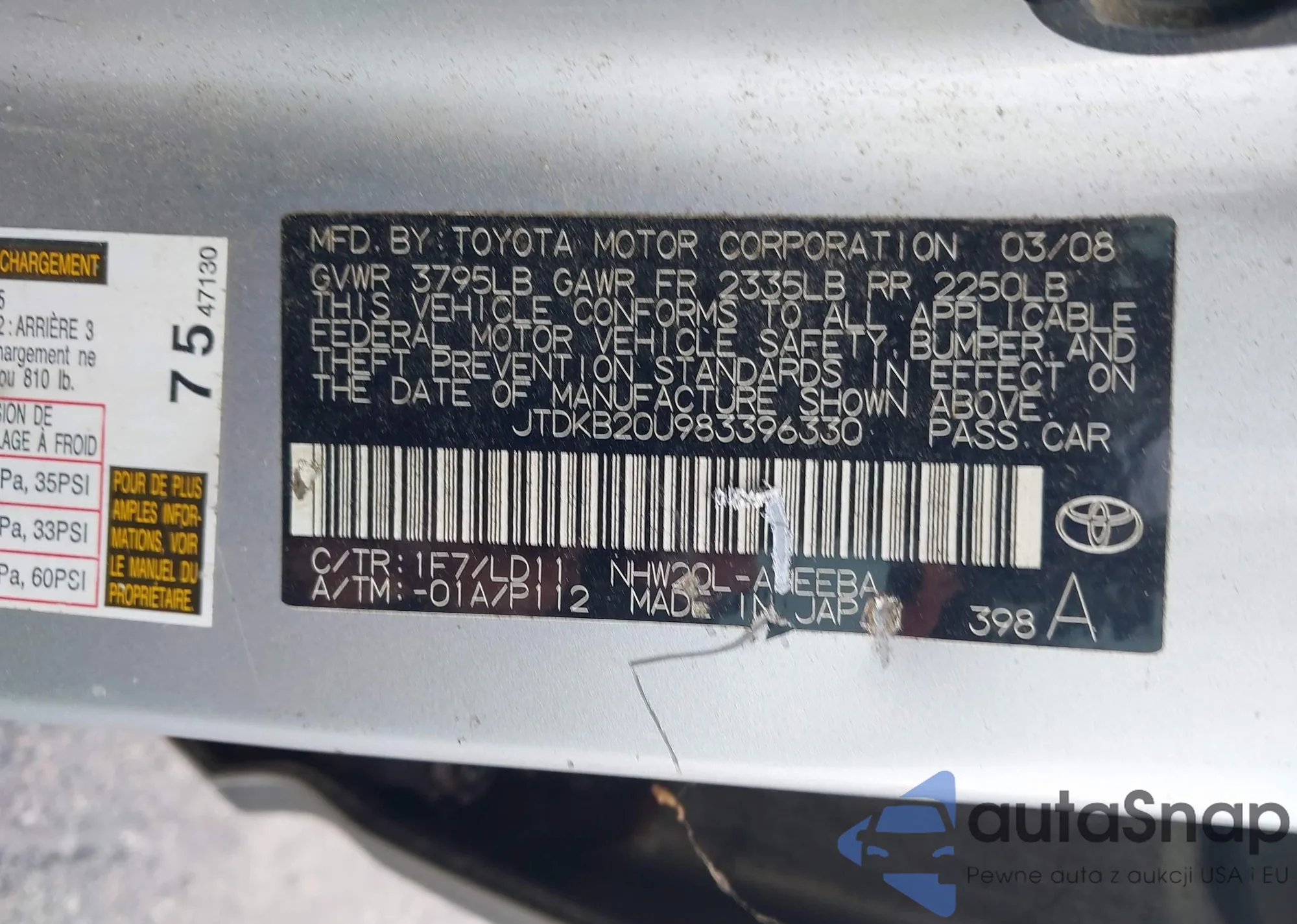 LOT: 42669663 VIN: JTDKB20U983396330