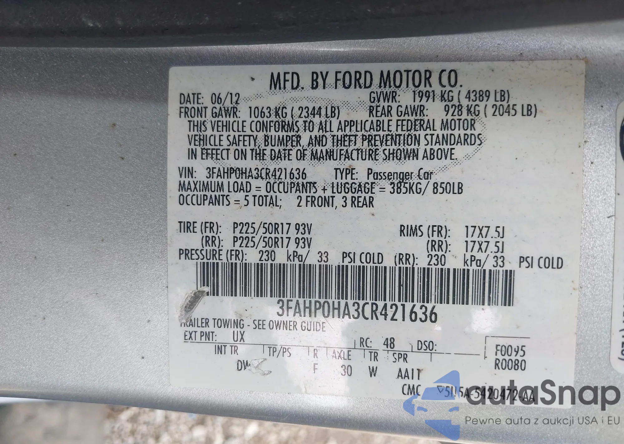 LOT: 42454385 VIN: 3FAHP0HA3CR421636