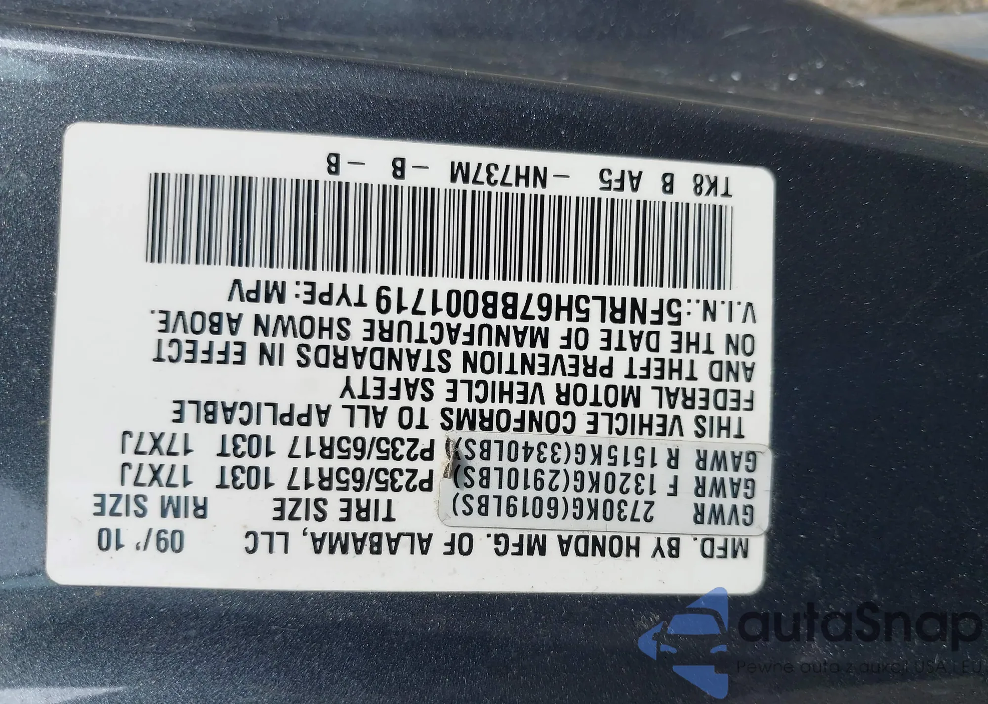 • VIN 5FNRL5H67BB001719