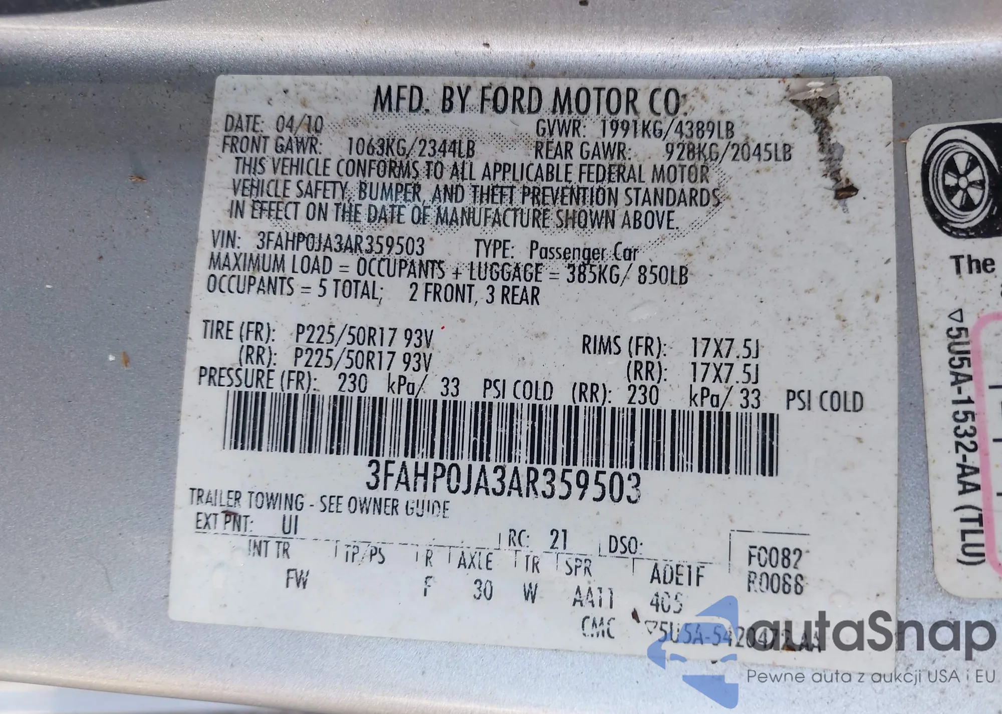 • VIN 3FAHP0JA3AR359503