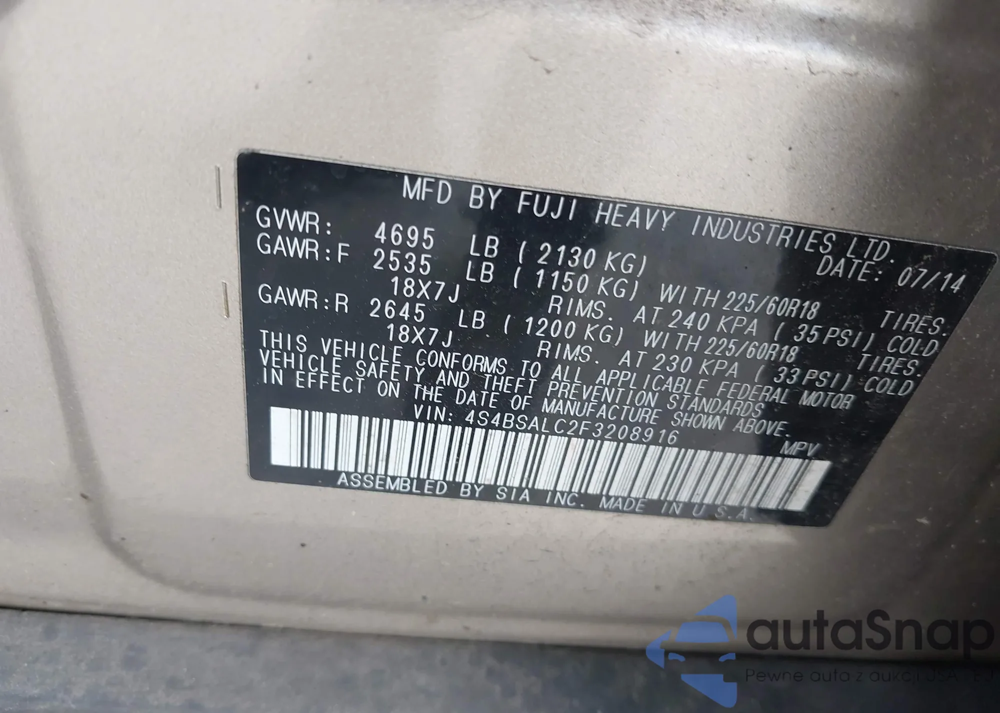 LOT: 42686170 VIN: 4S4BSALC2F3208916