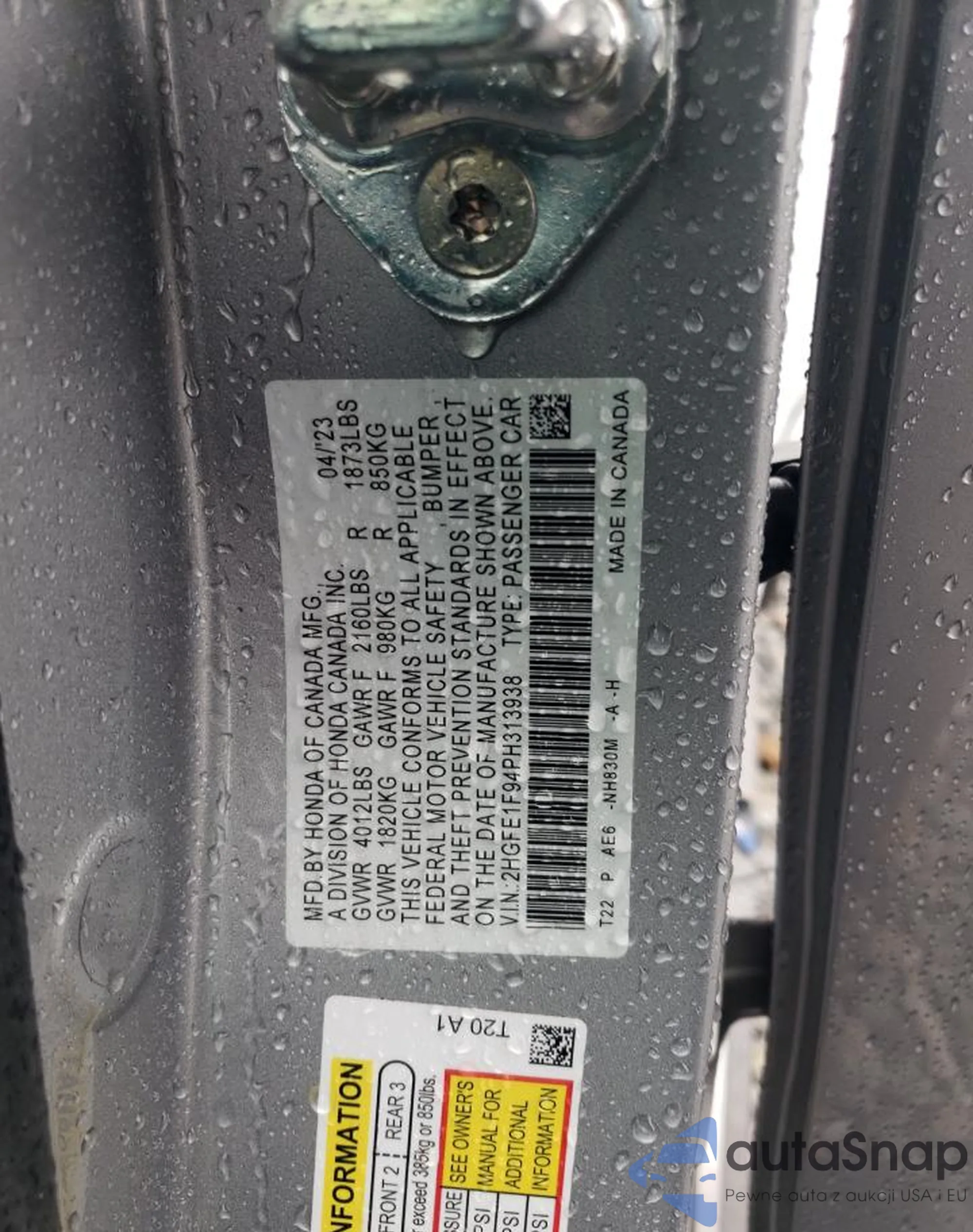 • VIN 2HGFE1F94PH313938