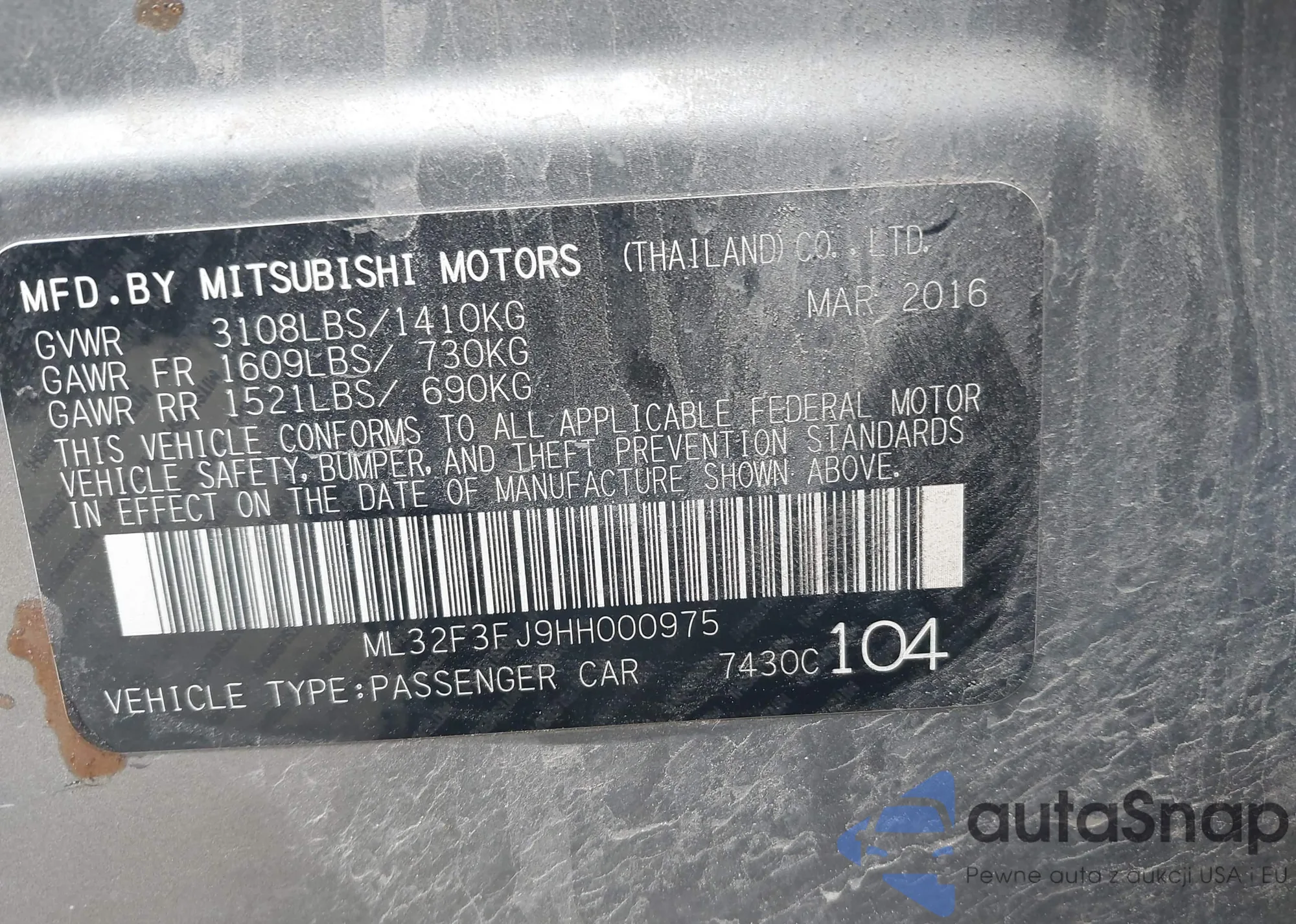 LOT: 42435145 VIN: ML32F3FJ9HH000975