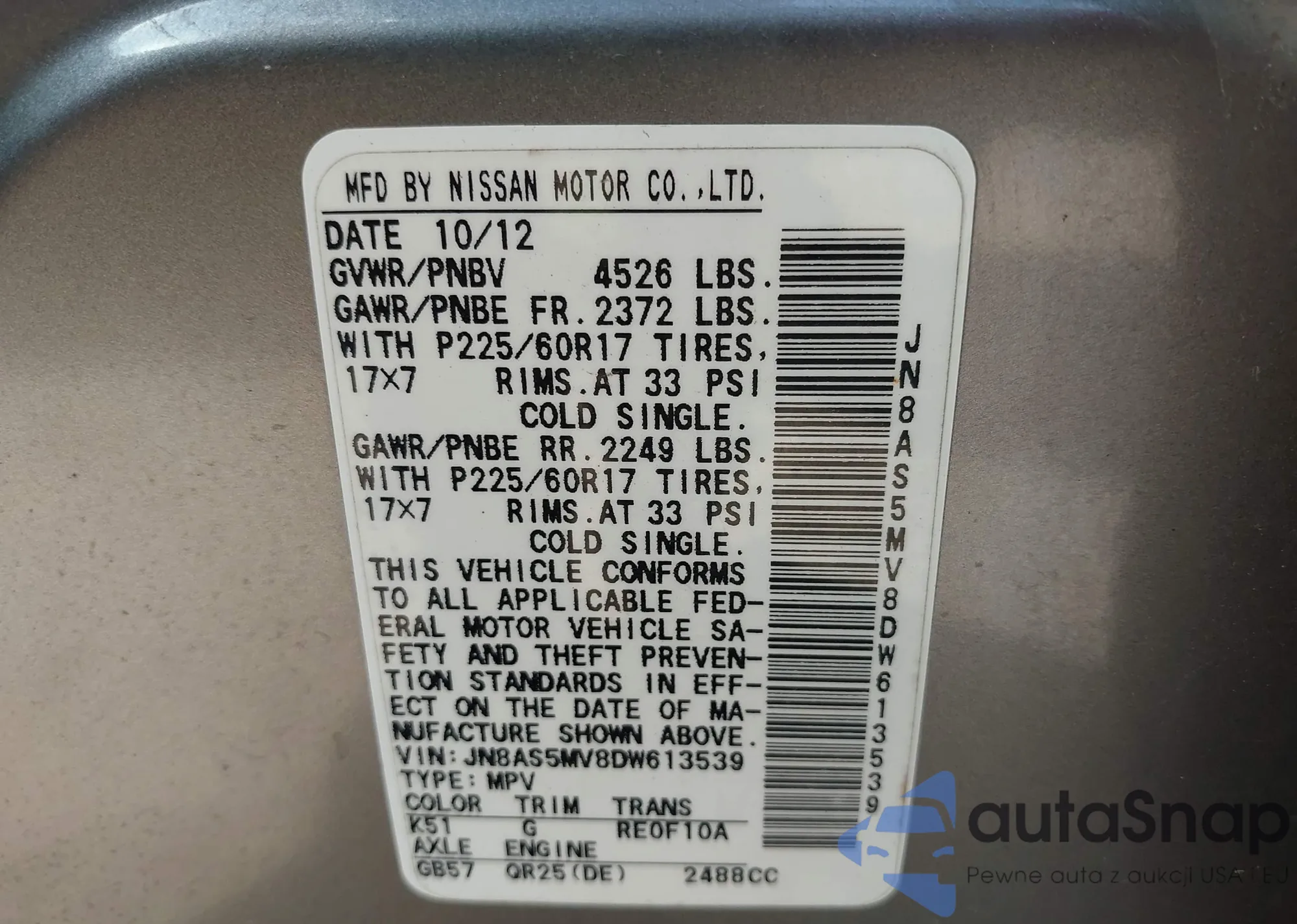 • VIN JN8AS5MV8DW613539