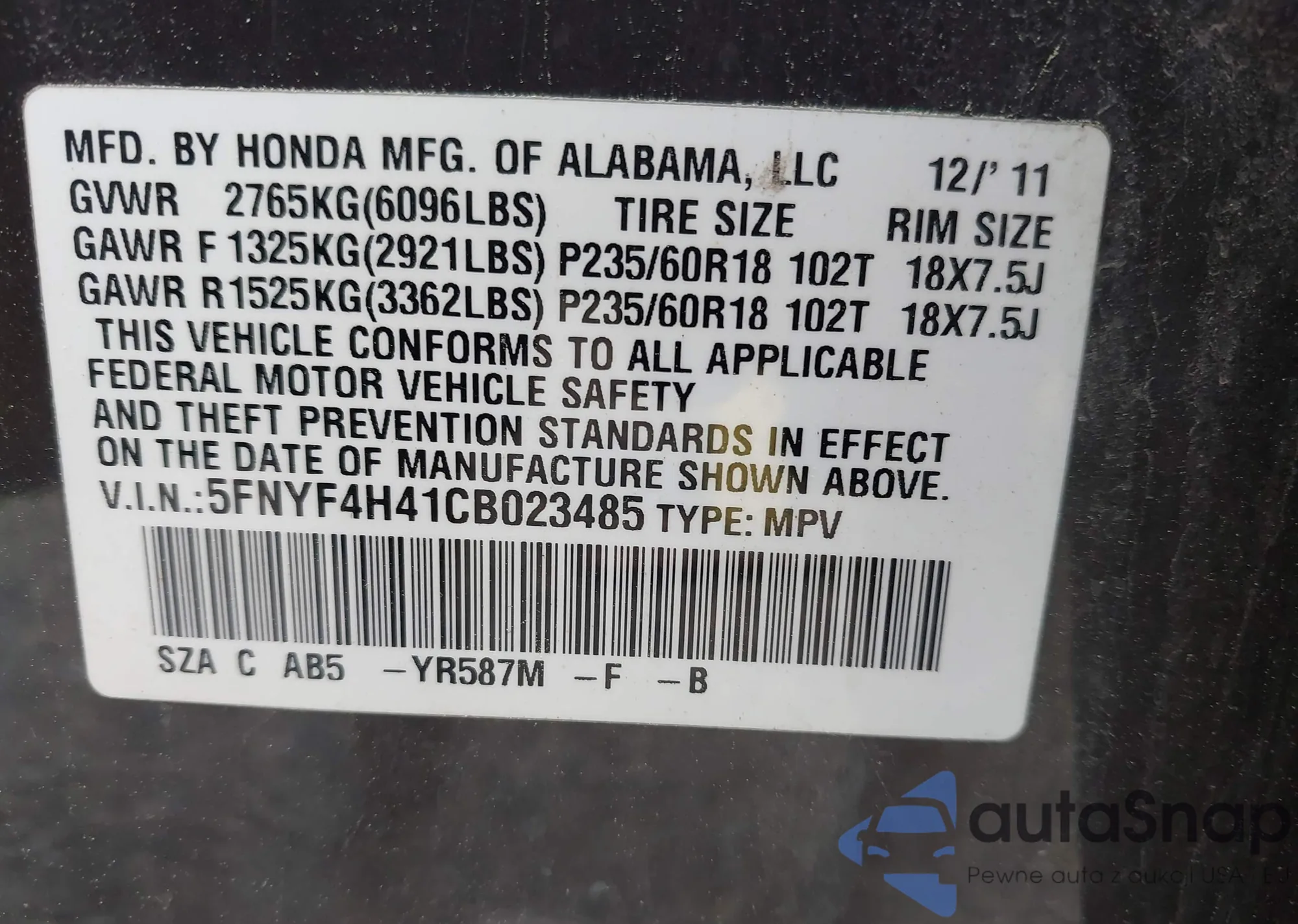 • VIN 5FNYF4H41CB023485